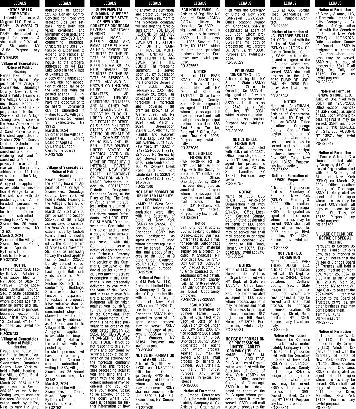C ompany (LLC ) Arti cles of Organizati on fi led wit h t he S ecr et ary of Stat e of New Y or k (SS NY ) on 11/17/2 02 3 Of fi ce l ocat ion: C ount y of O nondaga SS NY i s designa ted as agent of LLC up on whom process may be served SSN Y shal l mai l copy of process to: 8128 R izzo D ri ve, Cl ay NY 13041 Purpose: any l aw ful purpose S R-327156