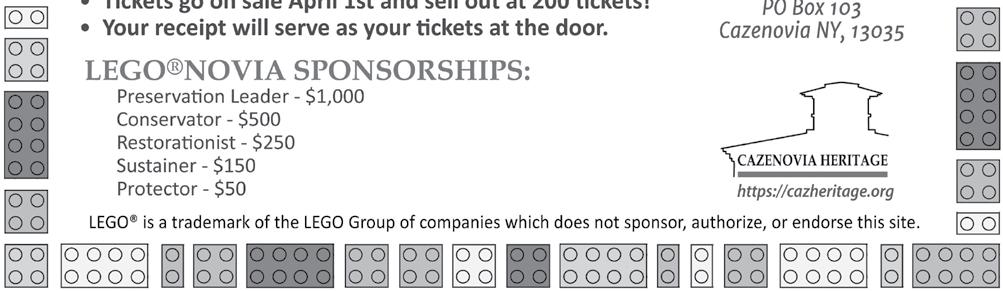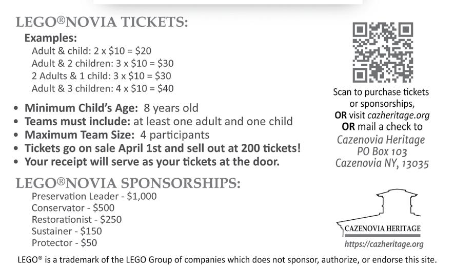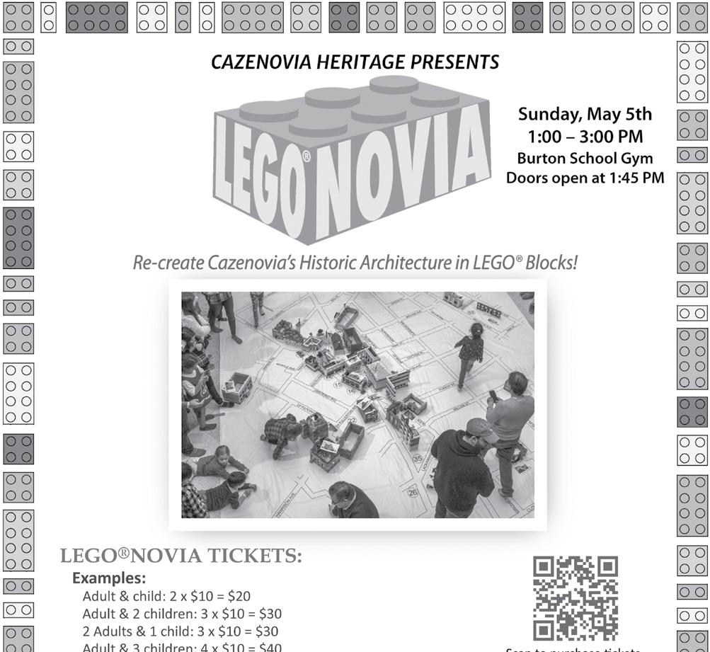“This looks to be both a fun and educational program, as well as an opportunity for the community to recognize the importance of protecting Cazenovia’s historic architecture for the next generation,” said Mike MacHugh of Cazenovia Heritage and co-coordinator of the event. “We’re encouraging everyone, in addition to participating families, to get into the spirit of LEGO®NOVIA by decorating shop windows or contributing a sponsorship.”