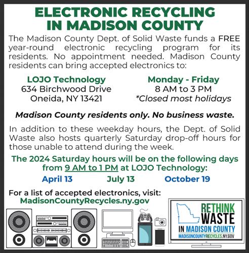 The weekend will feature a tree planting with the Village of Cazenovia Tree Commission, a ‘Native Plants and Pollinators’ workshop with Madison County Cooperative Extension, an electric vehicle show and a ‘Trash to Treasure’ competition at the Earth Day Fair. The public is invited to attend.