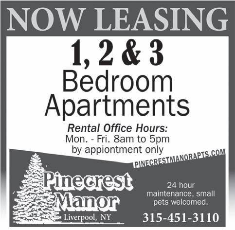 april 26, 2023 11 eagle News cNy’s community News s ource PENNY SAVER REAL ESTATE Visit our self-service site at www.theclassifiedsuperstore.com or call 315-434-8889, ext. 321. Deadline: Wednesdays at 7pm. PENNY SAVER EMPLOYMENT Visit our self-service site at www.theclassifiedsuperstore.com or call 315-434-8889, ext. 321. Deadline: Wednesdays at 7pm. Contact Patti Puzzo at 315-434-8889 ext. 321 or ppuzzo@eaglenewsonline.com Advertise Here! Call Us 437-6173 Need to Advertise it? Do You Have A Position to Fill ? GREENWAY APARTMENTS Greenway Apartments and Townhomes in Baldwinsville, NY features Studio, 1, & 2-bedroom apartments, and 2 & 3-bedroom townhomes. Conveniently located off of Route 31 and just 20 minutes from downtown Syracuse. residents at Greenway Apartments have acess to the Radison amenities which include hiking trails, supervised swimming pools, lighted tennis and basketball courts. and several playgrounds. Heat and hot water are included in the rent. Income Limits Apply! Please visit our website for further details: www.greenwayapartmentsbaldwinsville.com 8670 Braewood Drive, Baldwinsville 315-638-4575 TTY:711 NOTICE TOWN OF SPAFFORD Motor Vehicle Operator – Part-time Position The Town of Spafford is seeking applicants for a part-time Motor Vehicle Operator. Two (2) years driving experience and CDL-B license are required. Highway experience helpful but not necessary. Must be able to drive standard shift. Résumés are to be sent to the attention of Highway Supt. Jody Fisher at Town of Spafford, 1984 State Route 174, Skaneateles, NY 13152.