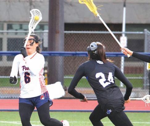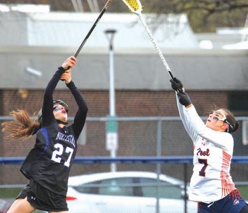 TOP: Cicero-North syracuse’s Gabby Putman (27) and liverpool’s Caitlyn Guilfoil (7) battle for the draw in last Tuesday’s game. ABOVE: Liverpool senior midfielder Abby Geary (6) works the ball past C-Ns’s Marissa Doty (24) in last Tuesday’s game. Geary had a goal and three assists in a 17-7 loss to the Northstars.
