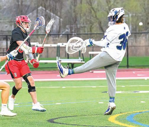 TOP: Cicero-North syracuse goalie leyton sullivan makes one of his 12 saves on Baldwinsville’s Garrett sutton in last Tuesday’s game at Bragman stadium. ABOvE: C-Ns forward Elijah Martin (1) tries to drive past Baldwinsville’s Dylan Wirtheim (10) in last Tuesday’s game. Martin had a goal and two assists in the Northstars’ 11-7 loss.