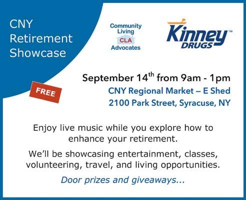 9 a.m.-1 p.m. CNY Regional Market. Brought to you by Community Living Advocates and Kinney Drugs. Free. Open to anyone planning to retire. Discover things to do, places to live, volunteer opportunities, and more. Enjoy food, live music, and giveaways.