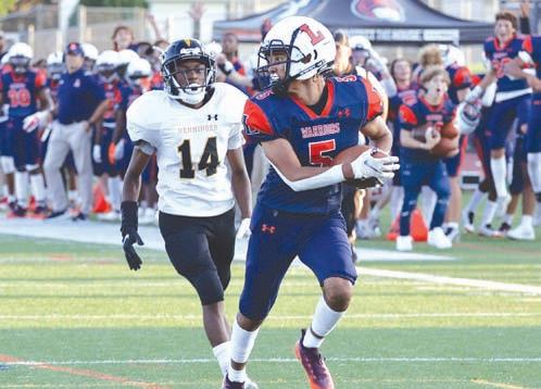 CLOCKWISE FROM LEFT: Liverpool High School students fill the stands at LhS Stadium for last thursday night’s football season opener, where the warriors defeated henninger 5924 in Joe Sindoni’s head coaching debut; Liverpool wide receiver Vincent McBride (5) finds the end zone on a touch down; Liverpool linebacker kendar Patterson(9) reaches out to make the tackle, with Jayden Forde (52) in pursuit.