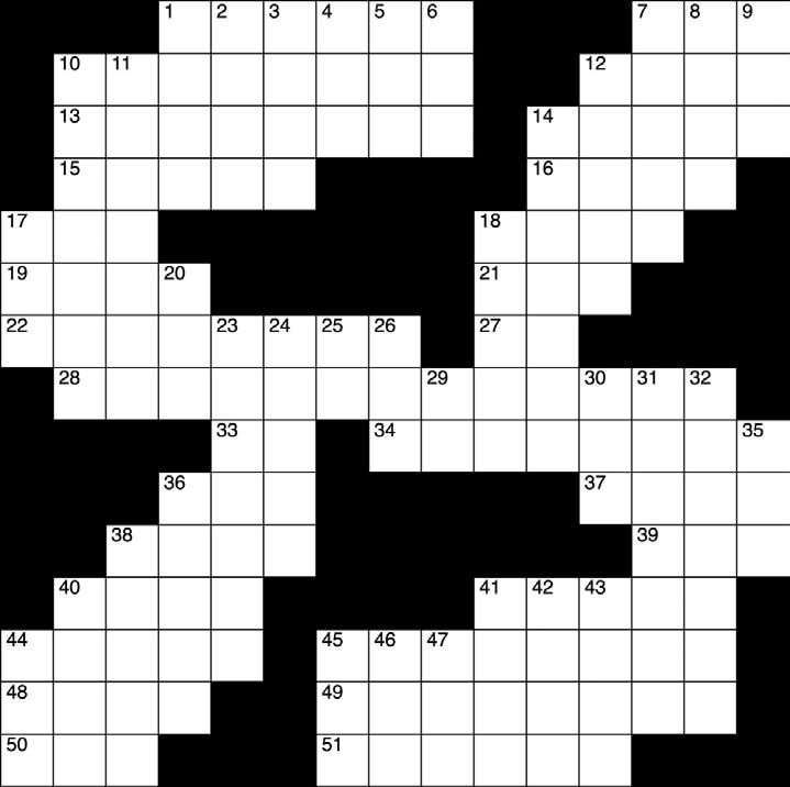 6 sept 20, 2023 eagle News cNy’s community News s ource PENNY SAVER BUSINESS SERVICE DIRECTORY Call Patti @ 315-434-8889, ext. 321 to get your ad in. Deadline: Wednesdays at 7pm. ACROSS 1. Type of crayon 7. Fashion accessory 10. Most cerebral 12. Incline from vertical 13. Dependent on 14. Broken in 15. Strongly desires 16. Mounted soldier 17. Ad __: when necessary 18. Cattle 19. Ottoman military commanders 21. __ student, learns healing 22. Composed in poetic meter 27. Promotional material 28. Where people live 33. Sodium 34. Embarrassing 36. Medical man 37. Mother of Hermes 38. One who saves the day 39. Tooth caregiver 40. Not clothed 41. Slope covered with loose stones 44. Used to cook 45. Praises enthusiastically 48. Rooney is a famous one 49. Beekeeper 50. Pigpen 51. Potato chip brand DOWN 1. Living quarters 2. Horizontal passage 3. Attacks 4. Vietnamese offensive 5. Midway between east and southeast 6. Con ned (abbr.) 7. Book of Esther antagonist 8. Port in Yemen 9. CNN’s founder 10. Type of bulb 11. Prepare 12. Promoted 14. Dinner jackets 17. Partner to cheese 18. Nebraska city 20. Human gene 23. Pays no attention to 24. Lowland South American plain 25. Blood group 26. Mauna __, Hawaiian volcano 29. Atomic #37 30. Unit of electrical resistance 31. Jeweled crowns 32. Nastiest 35. Traditional cars need it 36. Bowler hat 38. Robust 40. Not straight 41. Stony waste matter 42. Have an interest in 43. Jacob __, journalist 44. Maintains possession of 45. Swiss river 46. Average cost of market goods 47. Spanish soldier: El __