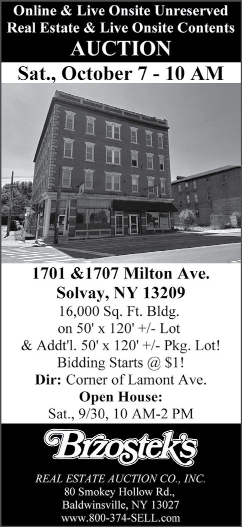 sept 20, 2023 7 eagle News cNy’s community News s ource PENNY SAVER BUSINESS SERVICE DIRECTORY Call Patti @ 315-434-8889, ext. 321 to get your ad in. Deadline: Wednesdays at 7pm. CA RS Drive Out Breast C ancer: Donate a car today! The benef its of donating your car or boat: Fast Free Pickup24hr Response Tax Deduct ionEasy To Do! Cal l 24/7: 855-9054755 GARAG E SALE C OME & FA LL INTO A GA RAGE SA LE SAV INGS EV ENT! Fri S ept 22 & S at Sept 23 9am-3pm 7525 Shalako C ircle B vil le Abbotts Landi ng Rt 370 Firepi t home décor fall & Christmas decorati ons fall & winter clot hi ng for woman, teens & men, boots accessories & more! GA RAGE S ALE: Sept 22 & 23 9am-4pm 2638 Connors Rd B 'vill e Various tools til e saw chop saw, cement mixer, 10ft C hri stmas t ree & much more! McHAR RI E TOWN E Community Garage S ale: Thursday & Friday S ept 21 & 22, 10am-4pm Dow nsizing! Household items, C ampi ng & Fishing Equipment, Jewel ry Gentl y Used Cl othing Entertai nment S uppli es & S o Much More! Office address: 2467 Betsy Dri ve Baldw insvill e ES TATE S ALE ES TATE S ALE Sell ing the Estate of Joseph and Mary Gorg oni a well known couple of Fayettevi lle-Manl ius and the owners of Joseph s at the C arri age House S alon Spa & Boutique This aucti on starts on 9/23 at 10am right at our facili ty 988 C ounty R oute 37 Central Square NY 13036 Items to incl ude Antiques, Jewelry, Fi ne collect ibl es wel l kept estate items Sell ing the Estate of Joseph and Mary Gorg oni a well known couple of Fayettevi lle-Manl ius and the owners of Joseph s at the C arri age House S alon Spa & Boutique This aucti on starts on 9/23 at 10am right at our facili ty 988 C ounty R oute 37 Central Square, NY 13036 Items to incl ude Antiques Jewelry Fi ne collect ibl es wel l kept estate items and more Previ ew thi s aucti on 9/22 12pm-4pm For a detailed l isting please visit our website https://www crossroadsaucti on net A uction Zi p or Facebook AUC TIONS www brzostek com Aucti ons Real Estate & Personal P roperty for Top Cash Price C all for Free No Obligation C onsultation! No Commissi on to S el lers on Real Estate! 315-678-2000 HELP WA NTED NEED A DRIV ER? Will dri ve for a small fee to help you run errands an d to provi de transportation when needed Dr appts casino shopping etc Caz DeWitt Fayettevi lle Manlius E Syr G reat ref erences Call Tom 315-560-2363 CAREER TRAINING C OMP UTER & IT TRAINING PROGRA M! Trai n ONLIN E to get the ski lls to become a C omput er & Help Desk P rofessional now! Grants and S chol arshi ps avai labl e for certain programs for qualif ied appli cants Cal l CTI for detai ls! (844)947-0192 (M-F 8am-6pm ET) C omputer with i nternet i s requi red WORK AT HOME EARN BIG MONEY WHILE YOU SA VE! New Membershi p Model Pays You To Share Amazon Net flix and C ostco Don t! Earn $25/membership referral and MORE on retail sales and Team Growth Unlimited Income Potential Go to 315 EAR N com NOW! MISCELLANEOUS MISCELLANEOUS A RE Y OU B EHIND $10k OR MORE ON Y OUR TAX ES? S top wage & bank levi es liens & audits unfi led tax returns payrol l i ssues & resol ve tax debt FA ST Cal l 888-8695361 (Hours: Mon-Fri 7am-5p m P ST) B ES T SA TELLITE TV wi th 2 Year P rice Guarantee! $59 99/ mo wi th 190 channels and 3 months free premium movi e chan nels! Free next day i nstal lat ion! C al l 888-5085313 DIV ORCE $389 - Uncontested divorce papers prepared Onl y one signature requi red Poor person A pplication i ncluded i f appl icable S eparatio n agreements C ustody and support pet itions 518-2740380 LA KEVIEW CEMETARY PLOTS Lakeview Cemetary plots Two graves Sect ion 11A Lot 137 (2 west graves-non-mo numented) Cemetary map availabl e onl ine Pl ease call 315-246-2042 TRAIN ONLINE TO DO MEDI CAL B ILLING! Become a Medical Office P rofessional onl ine at CTI ! Get Trai ned C erti fied & ready to work i n months! Call 855- 543-6440 (M-F 8am- 6pm ET) Computer with i nternet i s requi red A NNOUNCEMENTS A NNOUNCEMENTS Learn How To S quare D ance 2 FREE Beginner's Square Dance Lessons No Experience Necessary, Casual Dress When: Friday September 22 2023 and Friday, September 29, 2023 7:00 pm to 9: 00 pm Wher e: Fulton Municipal B ui ldi ng 141 S 1st Str eet Fulton NY 13069 These first two classes are free and thereafter $8 00 p er person No o bl igati on If you have any quest ions please contact Ray Schumacher: 315-857-8663 Ful ton S hirts N Skirts S quare Learn How To S quare D ance 2 FREE Beginner s Square Dance Lessons No Experience Necessary Casual Dress When: Friday September 22 2023 and Friday September 29 2023 7:00 pm to 9: 00 pm Wher e: Fulton Municipal B ui ldi ng 141 S 1st Str eet Fulton NY 13069 These first two classes are free and thereafter $8 00 p er person No o bl igati on If you have any quest ions please contact Ray Schumacher: 315-857-8663 Ful ton S hirts N Skirts S quare Dance C lu b WA NTED TO B UY V INTA GE B ARB IE DOLL C ol lect ions, Pre 1970 s only Doll s clothi ng & accessori es P lease call Di ane 315-657-5589 COMMERCIA L PROP ERTY ***1100 SQ FT i n North A rea of Syracuse 1s floor of fice/ retai l 315-455-7 090 LAND LAND FOR SA LE: 15 44 A cres of Residential Land for Sale on 60 Rd in Bal dwi nsvi ll e, NY l ocated wi thi n the P UD of the Radisson C ommuni ty C al l Qui nn Hubbard @ 315-47 9-3208 or emai l quinn hub bard@ esd ny gov for more informati on or to make an offer FCP NY FCP NY ATTEN TION Vi agra users: Generi c 100mg bl ue pills or generic 20mg yel low pill s Get 45 plus 5 free $99 + S/H Call today 1-866-589- 1706 ATTENTION: OXY GEN USERS! Gain freedom wi th a portable Oxygen Co ncentrato r! No more heavy tanks and refil ls! Guaranteed Lowest Prices! Call the Oxygen Concentrat or Store: 1-855-839 -1738 B EST SA TELLITE TV with 2 Y ear P rice Guarantee! $ 59 99/mo with 190 channels and 3 months free premium movie channel s! Free next day i nst al lation! Call 888-570-0887 C OMP UTER IS SUES? FREE DIA GNOSIS by GEEKS ON SI TE! Vi rus Removal Data Recovery! 24/7 EMERGENCY $20 OFF A