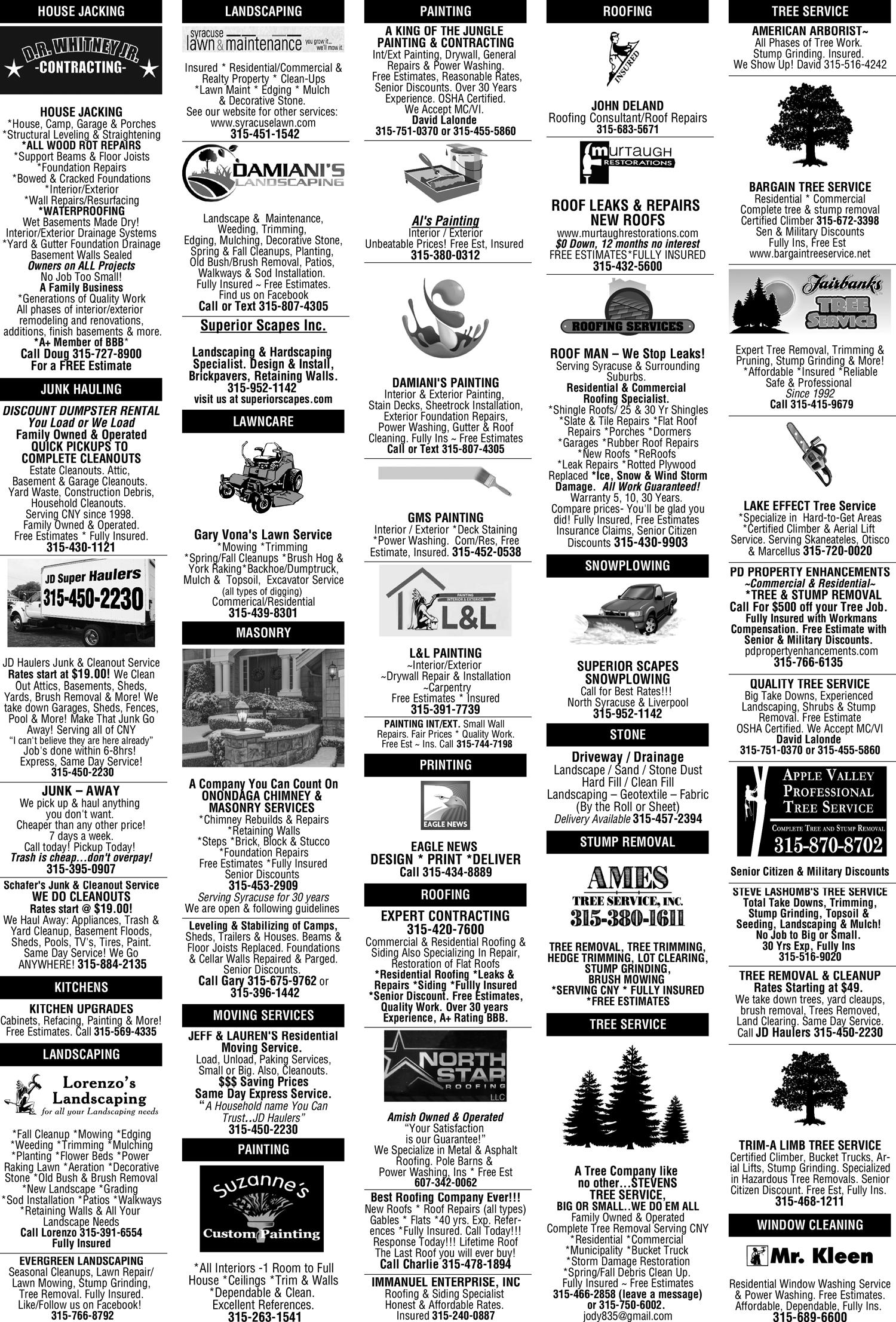 SUDOKU ***Perfe c t for Homeowner s*** 315- 430- 1121 Unlimite d Weight * No Hidde n Fe es BLA CKTOP PAVI NG & SEALI NG New Di gouts Res urf ac e Re pa ir or Se al Dri ve wa ys , Pa rk ing Lots , Roa ds etc F ree Es timat es Call Al LaMont 315-481-7248 (c ell ) All Qualit y Blac kt op & Conc ret e We ca n move the ea rth 1 pa rki ng lot dr ive wa y, side walk at a t ime! Cer tifi ed by the BBB We lcome Fr ont Li ne Res ponders , Seni or Citiz ens & Vet era ns Early bird s ge t the pri ce Se as ons On! Res/ Com We als o do: Pa rki ng Lots & Sidewalk s, Bric k, Bl oc k Concre te & Some Ca rpe nt ry B&E Pavi ng 315-278 -4454 Geneo *Hire a Local Company * Vi etnam Era Vet *St amped Conc rete *Conc rete Side wa lk s *Patio s *Gara ge Floors *Drive wa ys *Found at ion Re pa ir *Spr ay F oa m I ns ula tion F ree Es timat es Fully Insur ed Call 315- 761-2301 or 315- 750-6002 BI LL S ELECTRIC No J ob too Small Rea sona ble Rat es F ree Es t Insure d 315-422-6401 www billse lec com “B OB ” PAS CAL CHIM NEY “C NY s Oldest Chimney S ervice *REPAIR *RESTORE *REBUILD ALL WORK 100% GUARANTEED! PROFESSIONALLY INSTALLED “Hire t he ma n with tr owel in hand Put Bob” on t he Job! 315-729-2544 Al ways ask for “Bob” BOBPASCALCHI MNEY COM Expert Clutter Removal We c lean out y our junk , NOT your wall et ! Attic s bsmt s gar ages ya rds almos t a nyt hing! Ca ll Bruce @ 315-730-6 370 Yea r roun d se rvi ce! www expert clut ter com ADVERTISIN G BLACKTOP PAVING CH IM NEY SER VICES CH IM NEY SER VICES CLEANIN G CLEAN - OUTS CLEAN - OUTS CLUTTER R EMO VAL COM PUTER/ N ETWO RK SER VI CE CONCR ETE/ M ASON RY DEM OLITIO N DEM OLITIO N D UM PSTER SERVICE ELECTRICA L EXCAVATING FIR EWOO D FLO OR CLEANIN G GARAG E DO OR S & OPEN ER S GU TTER CLEANIN G GU TTER CLEANIN G GU TTERS HAND YM AN HO ME IM PRO VEMEN T CLEANI NG BY STEPH AN IE Speci aliz ed in Apar tme nt s, House s, Ai r BNB Offi ces & Busines se s Pr ov idi ng a Spec iali zed and Pr of ess io na l Clea ni ng Serv ice tail or ed t o your Nee ds Avail abl e We ek ly, Bi- We ek ly, Mont hly or Daily Compet itiv e Pr icing Cal l for F ree Consulta tion and Quote 315-406-6 935 DAVID' S Gut ter Cleaning, Mos s Remov al & Pre ss ur e Washing “We Show Up Cal l 315-516-4242 Masonry Repairist Ste ps , Fo unda tions , Chimne ys , Brick & Bloc k Base ments Stuc co 25y rs Exp Call Dav e 315- 395- 3041 A SMI LI NG DOUG'S ELECTR IC No Job too Big/Small I ns Lic 315-487-6177 Gai l s Qual ity Cl eani ng Prompt, Pr of ess io na l Ser vic e Lice ns ed s ince 2001, Low Rat es, Cle anouts, Re nta l Pr oper ty Commerc ia l & Open House F oll owi ng CDC St anda rds 315- 877- 0427 Ex ca vat ing Gra di ng Dozing *Dra ina ge & Septic Work *Top Soil *Mul ch *Stone *La wn & Dri veway Ins tal lat ion & Repai r *Demoli tion *Asbes tos *Conta ine r Rental 315- 656- DIR T (3478) gerber tops oil com EAGLE NEWS ADVERTI SING Need to adverti se your bus iness ? Have a job opening? Rental? We c an help y ou with a ll of your adve rt ising nee ds *Busine ss Ads *Employ ment Ads Re nt al Ads I ns ert s *We b Adve rtis ing Ad-A-Note s & Mor e! Call 315-434-8889 TODAY and w e can hel p you be the success you al ways w anted to be! IM PER IAL PAVING & MA SONR Y Pavi ng Driv eway Se aling *All t ype s of Concr et e & Mas onry 20y rs e xp F re e Es t Call & Save Bi g $$$ We ll be at a ny Con tra ct or s writ ten es tima te Quali ty does n' t h av e to cost a lot ! Ca ll 315-671-5 363 IMPERI AL MASONRY We do it ALL! Foundati ons, Si dewalks Gar age Floor s Retai ni ng Wall s, St amped Concrete, Pati os Qualit y doesn't hav e to cost a lot! 315-671-5363 NEED JUNK R EMOVED ? We Sa ve You Time & Mone y! Our Se rvic es : Applia nce Re mova l *Tra sh Ha uling *Yard Clea nu p Ga rba ge Dis posa l Junk Remov al *Cons truct ion De bri s Americ an Owned Vet eran Operated Conta ct Us Today for a FREE ESTI MATE 844- GET- JDOG ( 844- 438- 5364) jdogjunkr emov al c om JD Haule rs J unk & Cl eanout Serv ic e Rates sta rt at $19 00! We Cl ea n Out Att ics Base ments She ds Yar ds , Br us h Remov al & Mor e! We ta ke down Gar age s Sheds Fe nc es Pool & Mor e! Make That J unk Go Away! Ser vi ng all of CNY I can t believe they are here already Job' s done wit hin 6-8hrs ! Ex pr es s Same Day Se rvic e! 315-450-2230 Sc hafer s J unk & Cleanout Serv ic e WE DO CLEANOUTS Rat es s ta rt @ $19 00! We Ha ul Away : Applia nc es Tra sh & Ya rd Clea nup, Bas eme nt F loo ds , She ds Po ols TV's Ti res Pa int Sa me Da y Se rvi ce ! We Go ANYWHERE! 315-884-2135 We Tak e Down Gar ag es , Pool s, Sheds etc We also Haul Junk & do Tr ee Work Ve ry Rea sona ble Fr ee Est Insured Call JD Haul ers 315-450-2230 USE JD' S JUNK & TRAI LER SERVI CE!!! Our Tr aile rs will NOT RUI N your driv eway ! $20 off when you me nti on t his a d Call 315-884-2135 ATTENTI ON !!! JD'S HANDYMAN SERVI CE Money sa ving low p ric es No job too big or s mallI ! Men us e De wa lt tools th e boys use the c he ap tools” Ca ll J D, a ny plac e you live , we go! MC/VI 7 day s a wee k Call 315-884-2135 Right now you will re ce ive a fr ee $2 5 gift ca rd wi th one of our se rvi ces DEMOLI TI ON Great Prices, Full y I ns, Free Est 50 Years In Busin ess Com/Res Fi sher Compani es 315- 652- 3773 LEN'S FLOOR CARE F loors Dull & Dir ty? Spec ializi ng In F loor Ca re Com/Res Cl ean & Polis h Floor s Har dwood Cer amic & Tile Car pe t Cl ea ning F ree Es t 315-433-9536 Keep Calm, Keep Clean *Re side nt ial *Off ice *Ga ra ge *One Time De ep Cl eaning Call or e ma il for fre e quote 315- 352- 3682 cleanwithol iv ia@gmail c om Liver pool Seam less Gutt er s Serv ing CNY for over 30 Years 10 yr wa rra nt y Va riet y of Col os Ne w Ins tal ls, Re pai rs, Cle anouts, Le af Prote ct ion Soff itt Replac ement & Repair s F ree Es t Fully Ins 315-457-0403 li verpools eamless gutt er s co m HAN DYM AN LUKE GRAVES No J ob to Bi g or Small 315- 396- 8570 or 315- 676- 5906 MID-S TATE DOOR, INC 505 F ac tor y Ave Sy rac us e Gar age Doors & Ope ne rs Fe aturi ng Amarr 