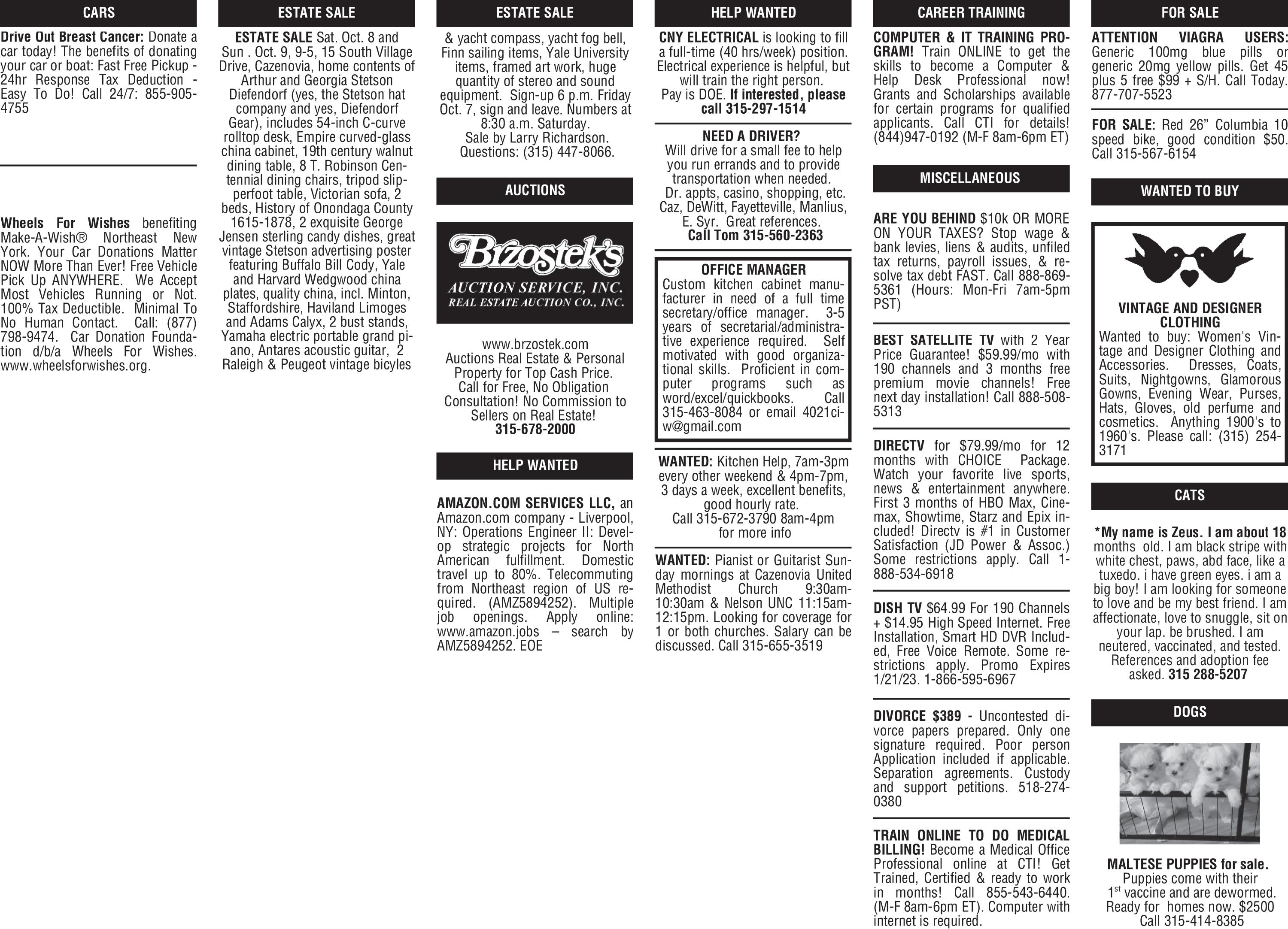 7 p.m. Cazenovia Library, Community Room. The Library will host a special presentation titled “Hon oring World War Casualties of Madison County, NY.” Madison County Historian Matthew Urtz will talk about his new book of the same name. He will tell a few of the stories of soldiers that were killed in the line of service in WWI & WWII. Copies of the book will be available for purchase.