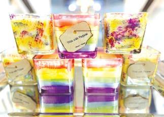 The signature 12-ounce “Pride with Purpose” candles are contained in hand-painted rainbow jars. The coffee & marshmallowscented candles are 100 percent all-natural soy wax with crackling wood wicks with approximately 70 hours of burn time.