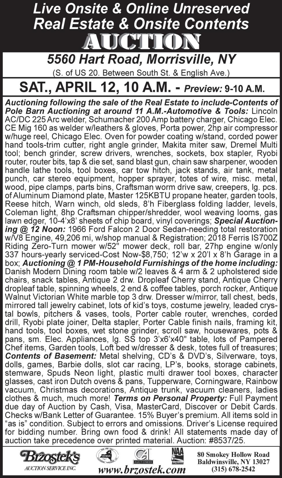 This is a partial listing. Sale inside. Food Available. Absolutely no buyer’s premium. Terms: cash, good NYS check, Discover, Visa, MC payment due by end of the auction Dean D Cummins Auctioneer & Sales Manager Office: 315-626-2248 Cell: 315-246-5407