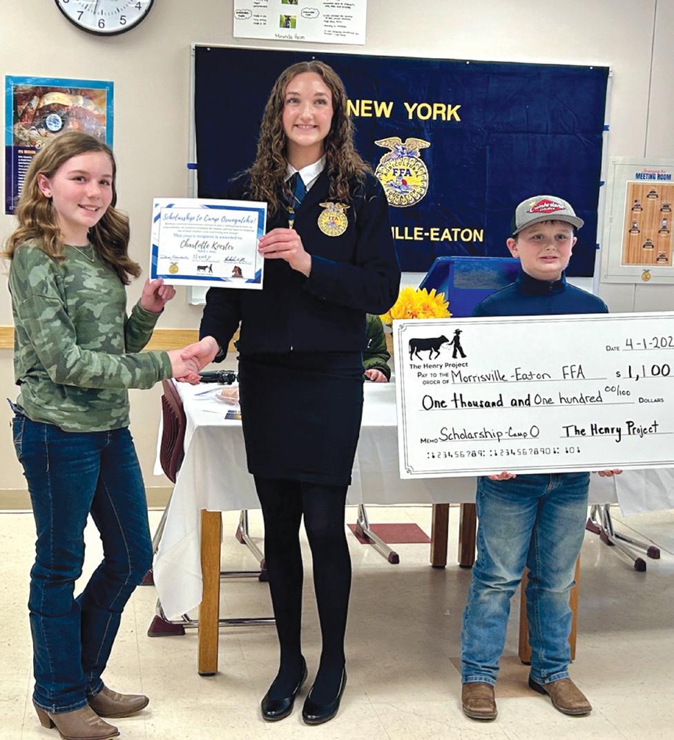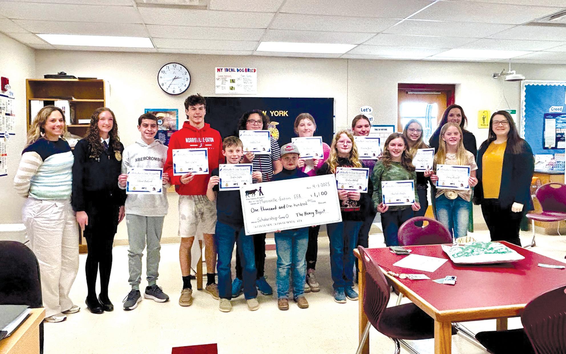 photoS on april 1, Henry stocks, a second grader at Cazenovia’s Burton street elementary school, presented a $1,100 check to the Morrisville-eaton Central school Future Farmers of america (FFa) to pay 10 students’ tuition to FFa’s Camp oswegatchie. stocks raised the money by selling raffle tickets for a “2-night get-away and Farm experience with Henry,” donated by owera Winds Bed & Breakfast in Cazenovia. Morrisville-eaton FFa advisor Rebecca Werbela and faculty members selected the 10 students based on their demonstration of FFa values, initiative, willingness to take on responsibility, ability to set positive examples for others, and openness to stepping out of their comfort zone and trying new things. the 2025 Henry Project Campership Award recipients are Leland Babcock, taiden eaton, trenton eaton, dahlia Cook, tori Barrett, kendra abbott, Breanna Green, Charlotte koester, Maddy Corey, and emery Russell. the Henry Project is a multi-faceted, long-term photographic documentation of stocks growing up on a small farm in new Woodstock. Follow the initiative on Instagram @just_a_ boy_and_his_cows or visit rjketchamphotography.com/ the-henry-project/ for more information.