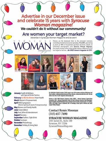 Unlike any other publication in the Syracuse area, our feature articles address major topics that interest local women. Each issue includes articles on health, fashion, fitness, finance, home matters, dining, lifestyle and personal perspectives, as well as a spotlight on local Syracuse women. Ads are due on the 15th of the month prior to publication. The print magazines will be distributed locally in over 350 locations and will be in your inbox electronically by the middle of every month.