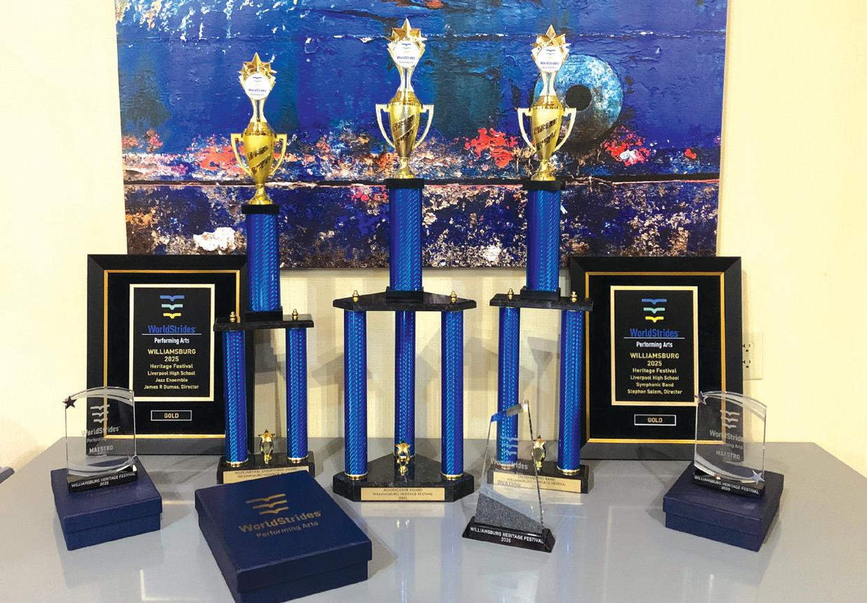 festival. the students and directors had the opportunity to showcase talents at this national festival, and receive expert feedback from renowned adjudicators. the LHS Symphonic Band and LHS Jazz Ensemble each earned a Gold Award, as well as the instrumental Sweepstakes Award (two or more instrumental ensembles from same school with scores closest to perfect score of 100). the Symphonic Band also received the Outstanding Band Award (highest band score) and the Adjudicator Award (score of 92 or higher to be eligible and picked by judge panel). Based on their performance, the LHS Symphonic Band earned an invite to the festival of Gold 2026 in either Chicago or Nashville. individually, LHS senior William Sateriale (clarinet) and junior Emma Bearup (trombone) were presented with maestro Awards as outstanding soloists and received invitations to an international music festival, while senior Samuel Anderson (euphonium) received the Ovation Award for citizenship.