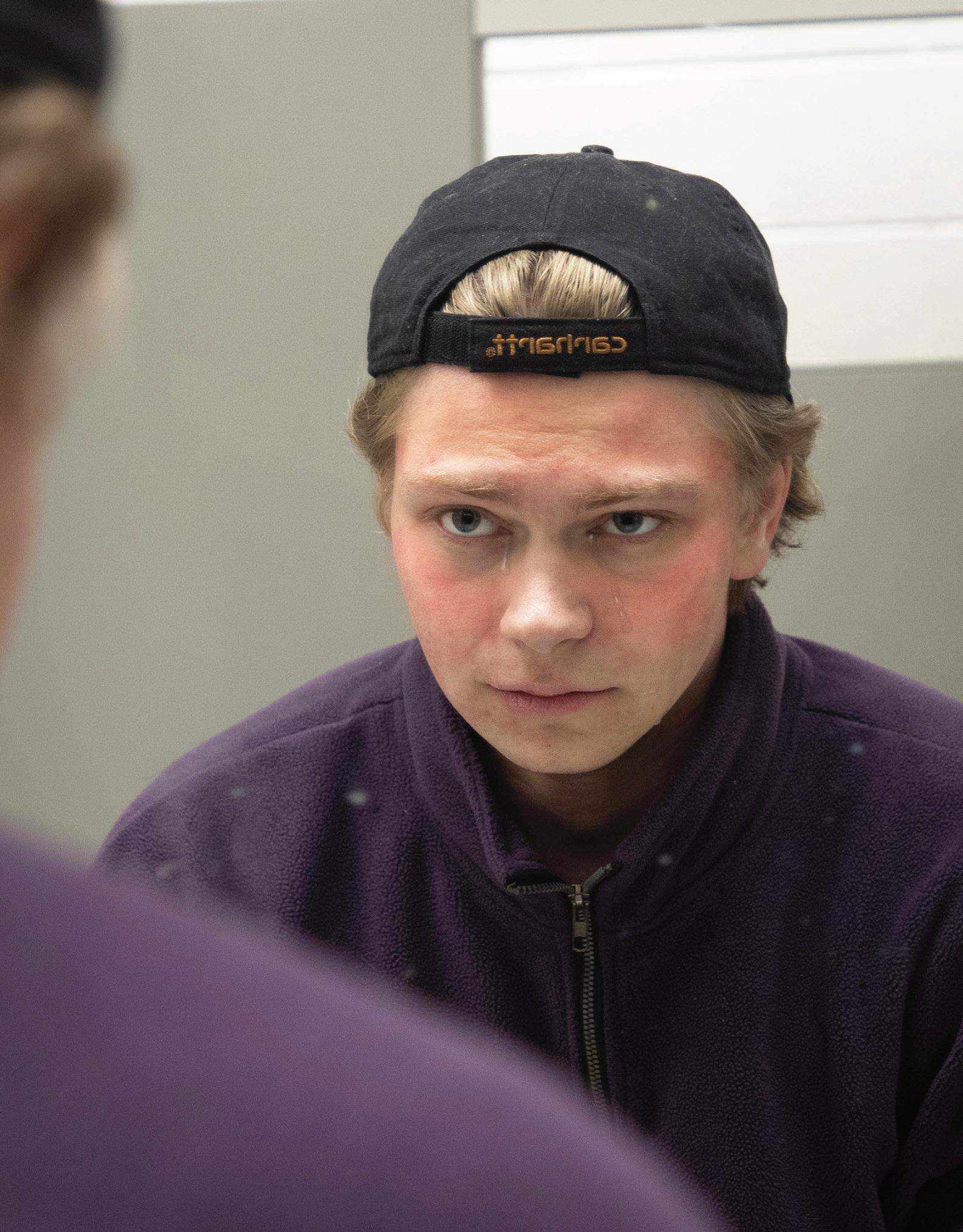 LET IT OUT: Senior Theo Odendahl poses for a photo in the mirror. Men struggle with not being allowed to cry their whole lives. This causes lash outs, breakdowns, and more. This unspoken rule that men can’t cry needs to stop.