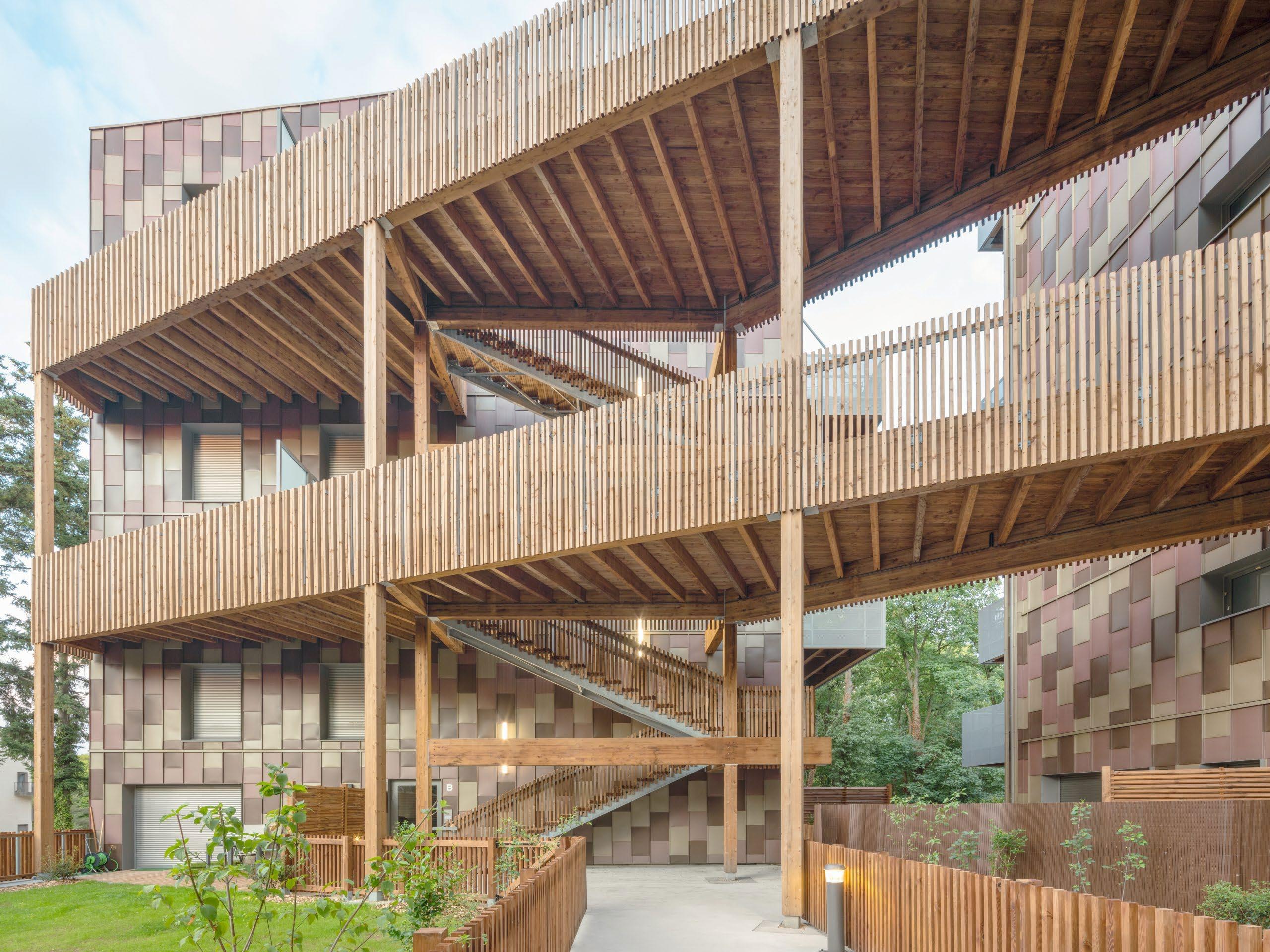 On observe sur les photos, en écho aux arbres de la forêt, les écailles du bardage, comme une écorce, qui donnent un caractère chaleureux, écologique et unique à ce projet.