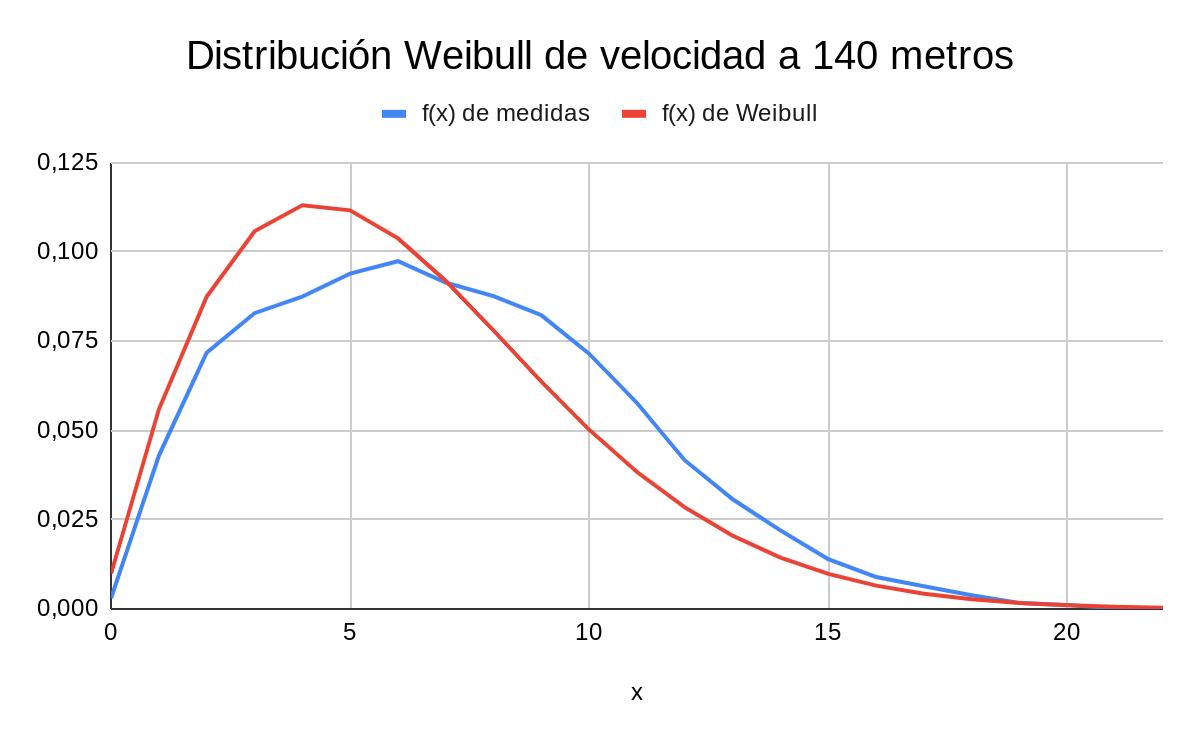 En la Figura 4, se ha utilizado la distribución Weibull para determinar en qué franjas hay más probabilidad de obtener una velocidad de viento determinada Esto se puede observar comparando la distribución Weibull en base a los datos obtenidos (rojo), con la intersección del área marcada por debajo de la línea de la distribución normal de estos datos (azul) De él se desprende que el intervalo de 0-7 m/s es la velocidad de viento más probable, mientras que el resto de velocidades serán, a priori, menos frecuentes