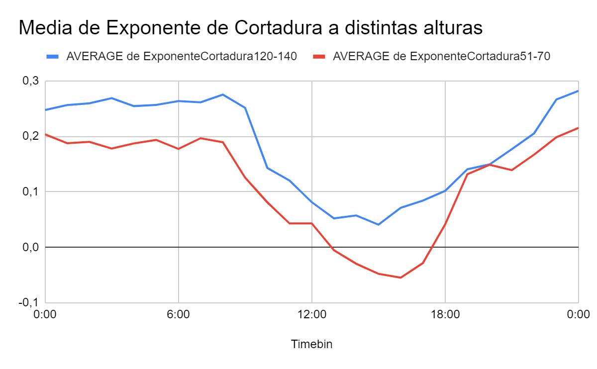El exponente de cortadura varía dependiendo de la altura del sensor y del momento de la recogida de datos, tal como se observa en la Figura 9 En este caso a mayor altura se obtiene un mayor valor del exponente de cortadura Durante las horas del día más cálidas, 12:00-18:00, los valores pueden llegar a alcanzar puntos incluso negativos Esto significa que el aumento de la velocidad del viento es mínimo