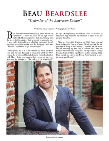 he says. “Complacency would have killed us. We had to remain on high alert and pay attention to detail to do our job and stay alive.” After his honorable discharge in 2008, Beau returned home to beautiful Orange County full of gratitude for the privilege of living in this country. “I saw evil and the worse face of humanity my first day in combat, and I saw the turmoil the tribes were living in. Coming home to Orange County, I realized that I got to live in this amazing State. I had earned my right to say I’m an American and to have the American Dream.”