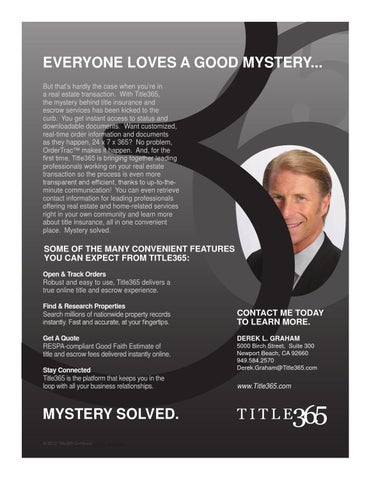 But that’s hardly the case when you’re in a real estate transaction. With Title365, the mystery behind title insurance and escrow services has been kicked to the curb. You get instant access to status and downloadable documents. Want customized, real-time order information and documents as they happen, 24 x 7 x 365? No problem, OrderTrac™ makes it happen. And, for the The Power Title365 first time, Title365Of is bringing together leading professionals working on your real estate transaction so the process is even more transparent and efficient, thanks to up-to-theEveryone loves a good mystery. But that’s hardly the case Open & Track Orders minute communication! You can even retrieve when you’re in a real transaction. With Title365, the Robust and easy to use, contact information forestate leading professionals mysteryreal behind titleand insurance and escrow services has been Title365 delivers a true online offering estate home-related services kicked theown curb. You get instant access title and escrow experience. right in to your community and learn moreto status and downloadable documents. Want customized, real-time order about title insurance, all in one convenient information and solved. documents as they happen, 24 x 7 x 365? place. Mystery No problem, OrderTrac™ makes it happen. And, for the Find & Research Properties first time, Title365 is bringing together leading professionals Search millions of nationwide SOME OF THE MAny COnvEniEnT FEATuRES working on your real estate transaction so the process is property records instantly. yOu CAn ExPECT FROM TiTLE365: even more transparent and efficient, thanks to up-to-theFast and accurate, at your minute communication! You can even retrieve contact fingertips. Open & Track Orders information for leading professionals offering real estate Robust and easy to use, Title365 delivers a and home-related services right in your own community and true online title and escrow experience. learn more about title insurance, all in one convenient place. Get A Quote Mystery solved. RESPA-compliant Good Find & Research Properties Faith Estimate title and COnTACT ME ofTODAy Search millions of nationwide property records feesMORE. delivered instantly. Fast and accurate, at your fingertips. TOescrow LEARn instantly online. Contact me today to Get A Quote DEREK L. GRAHAM learn more. 5000 Birch Street, Suite 300 RESPA-compliant Good Faith Estimate of StayBeach, Connected Newport CA 92660 title and escrow fees delivered instantly online. Title365 is the platform 949.584.2570 that keeps you in the loop Derek.Graham@Title365.com DEREK L. GRAHAM Stay Connected 5000 Birch Street, with all your business Title365 is the platform that keeps you in the Suite 300 relationships. www.Title365.com loop with all your business relationships. Newport Beach, CA 92660 Mobile: 949.584.2570 Derek.Graham@Title365.com