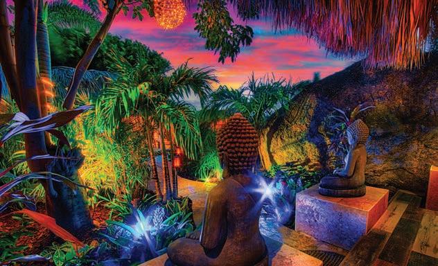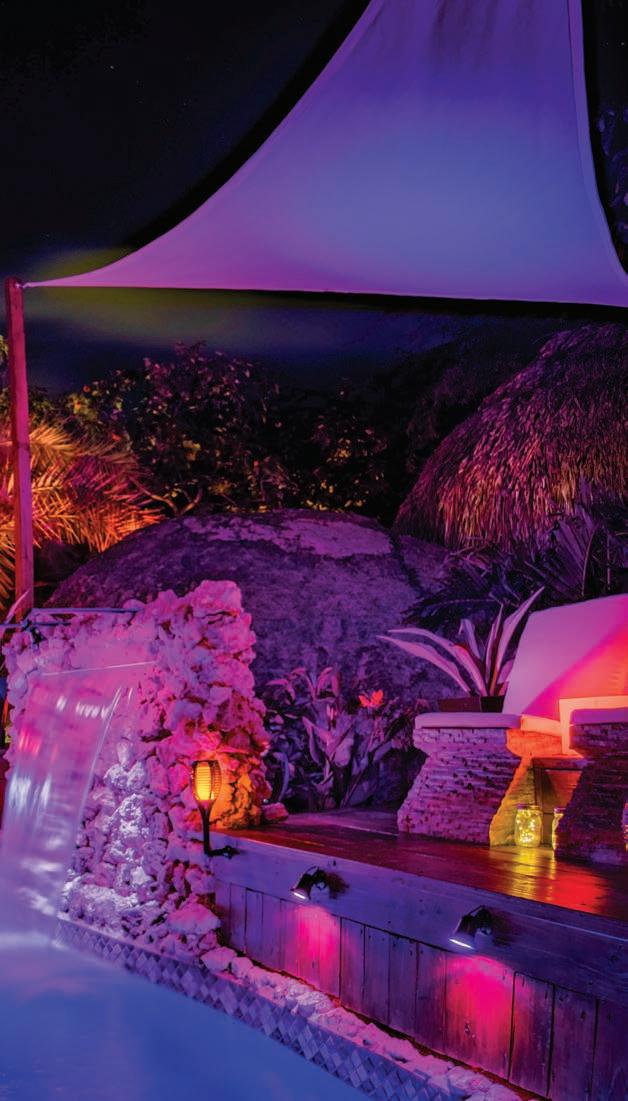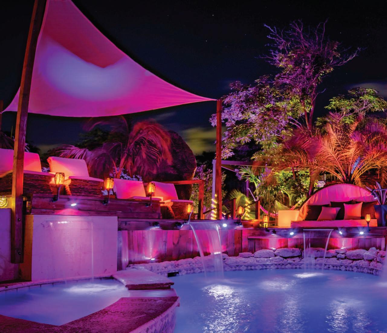 Bali Retreat Aruba is a unique vacation home inspired by South East Asia, featuring a resort-style pool amidst giant boulders, a cave, Buddha statues protruding from an imposing rock wall with waterfalls cascading into the heated indoor lap pool, private cinema, yoga pavilion, and a beach volleyball court.