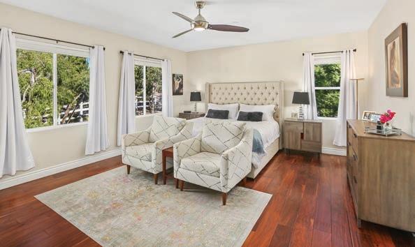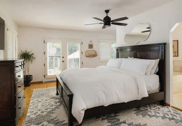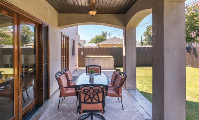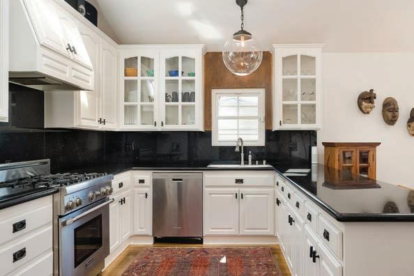 This 5 bedroom/3 full bathroom single-family home is very charming and has exquisite curb appeal. The main entry, with its fabulous solid wood door, opens up to a spacious living area that features original hardwood flooring and stone insets. On the main level, there are two bedrooms. The main bedroom receives plenty of natural light and has an en-suite bathroom that features a raw travertine stone countertop, and a large, enclosed shower with rock walls and flooring. This room also features a French door that opens to a stone patio overlooking the tranquil backyard. The kitchen features granite countertops, a peninsula, all stainless steel appliances, a dual bowl sink, and high ceilings with skylights, and it flows harmoniously into the dining area. This magnificent area is full of natural light and perfect for gathering and entertaining.