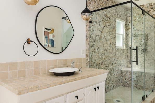 This 5 bedroom/3 full bathroom single-family home is very charming and has exquisite curb appeal. The main entry, with its fabulous solid wood door, opens up to a spacious living area that features original hardwood flooring and stone insets. On the main level, there are two bedrooms. The main bedroom receives plenty of natural light and has an en-suite bathroom that features a raw travertine stone countertop, and a large, enclosed shower with rock walls and flooring. This room also features a French door that opens to a stone patio overlooking the tranquil backyard. The kitchen features granite countertops, a peninsula, all stainless steel appliances, a dual bowl sink, and high ceilings with skylights, and it flows harmoniously into the dining area. This magnificent area is full of natural light and perfect for gathering and entertaining.