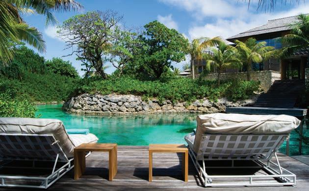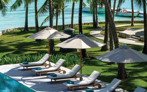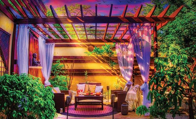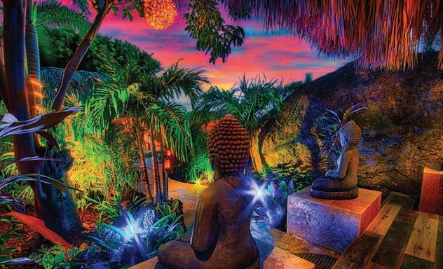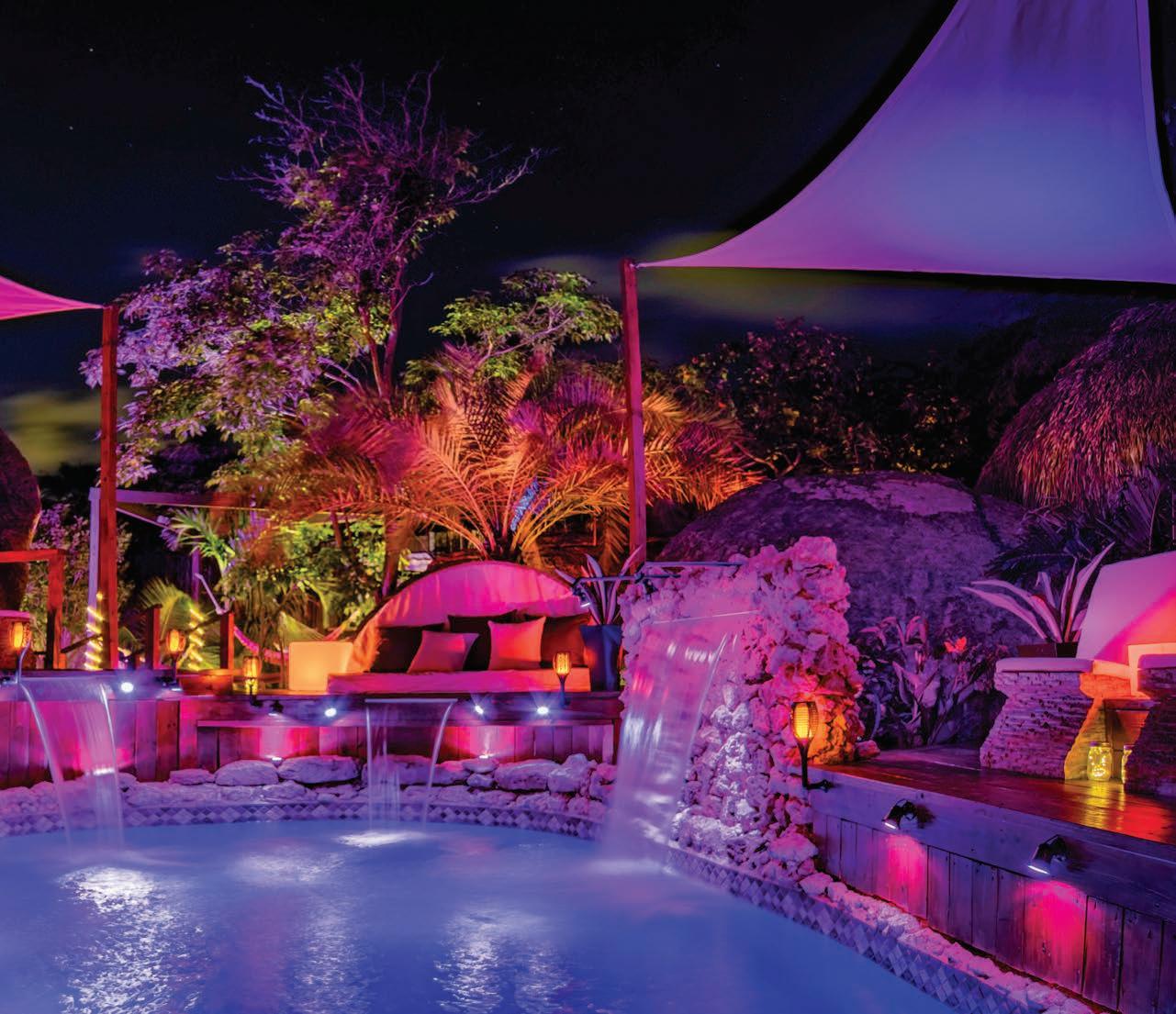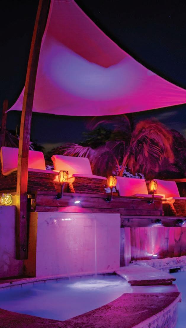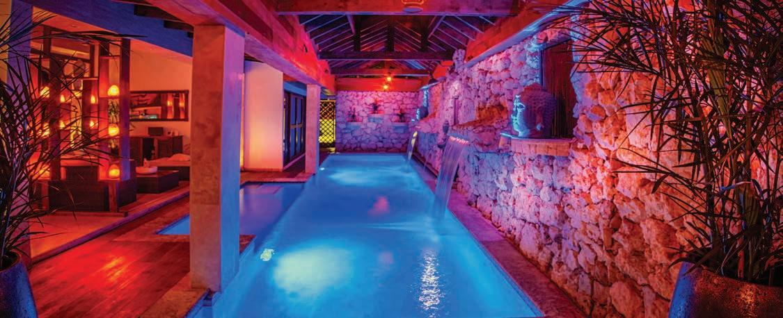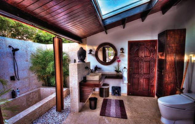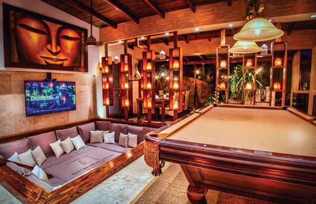 Bali Retreat Aruba is a unique vacation home inspired by South East Asia, featuring a resort-style pool amidst giant boulders, a cave, Buddha statues protruding from an imposing rock wall with waterfalls cascading into the heated indoor lap pool, private cinema, yoga pavilion, and a beach volleyball court.