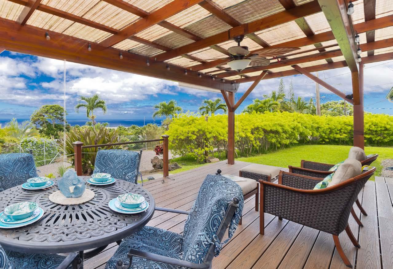 Enter the property through the wrought iron gate with lighted lanterns atop the rock pillars. Green lush lawns & tropical foliage guide you to a welcoming entry to a very attractive single level home for your Hawaiian style living. Property is partially fenced & includes a gate to the lower property. Lots of parking for your boat, trucks & toys. A Light & airy open living area with sliders to the spacious lanai & ocean views. Enjoy sunsets & al fresco dining on your Lanai with trex decking. New luxury vinyl flooring & tile in the kitchen & baths. Fresh paint throughout, a new roof installed in 2020. The kitchen features a tropical wood breakfast bar, gorgeous granite countertops & backsplash. Stainless appliances. A Conveniently located laundry area off the kitchen with side-by-side W/D. The ensuite is located at the south end with a slider that opens onto the gardens. The 2 west bedrooms share a full guest bath. Both guest bedrooms have sliders that open to a lanai with ocean views. Home is clean & pristine, move in ready. A magnificent Banyan tree adorns the south side with shady paths & a sanctuary for birds. New features include: Owned solar system w/battery back up with an EV charger in covered carport, 3 AC splits, new driveway, fencing for your children or pets, new flooring, new stove, new hot water tank, new kitchen sink and faucets. Located at approximately 900 ft elevation, the sweet spot for cooler temps and makau showers. Conveniently located near the airport, shopping center, and beaches. The 2 gated entries offers flexibility for adding another possible dwelling, orchard, raised gardens & Kona Coffee adding to the property’s versatility and value. Charming, well-equipped property combines modern amenities with natural beauty. An opportunity for those seeking a comfortable and inviting living space in a desirable location.