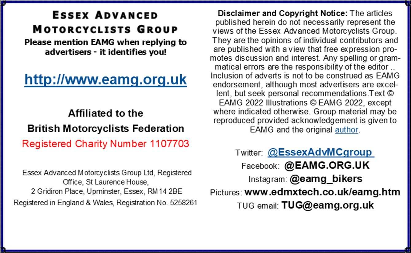 So enough moaning from me, time to ask if anyone would consider assisting Bob Cowl by occasionally leading the midweek rides, particularly while our dear friend Neil Bullock is taking a little break from it. Social rides are a very important aspect of EAMG, a chance for you to get to know each other better in a relaxed environment. If anyone is interested please do email me at chair@eamg.org.uk or preferably email Bob at bigbobcowl@yahoo.com. You can find out more about the social rides from Bob’s article in this edition of TUG. Also if anyone has any ideas of other activities we can look at please feel free to let any committee member know. We are looking at ways of having more social interactions. I must say the move to Little Channels has worked well, the room is better to use and we just about fill it too. On that note I look forward to seeing you at our next group night.