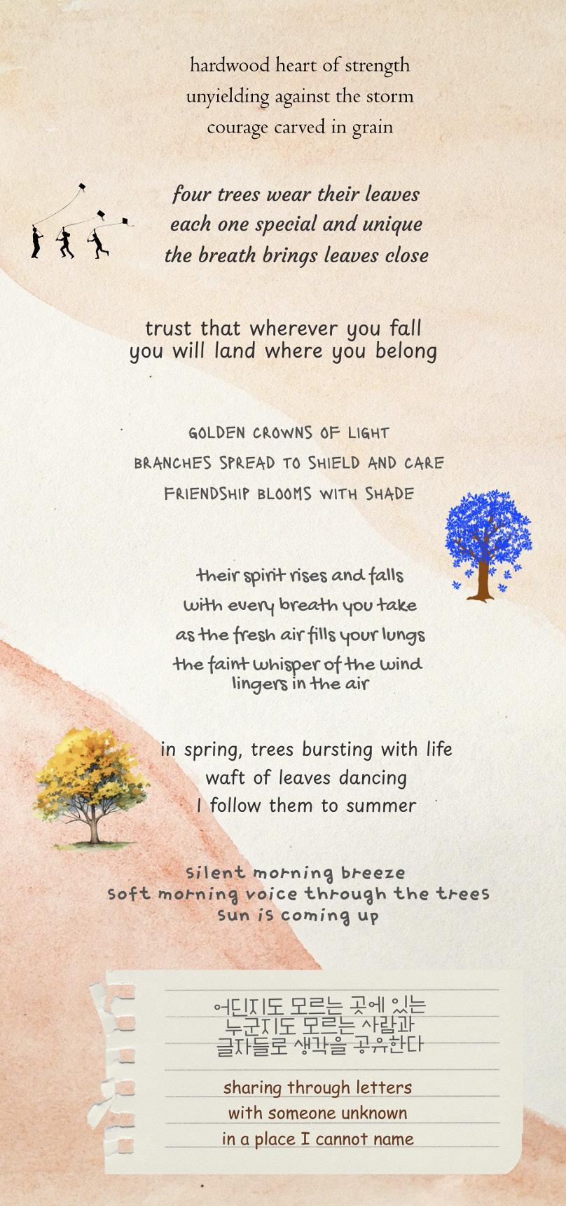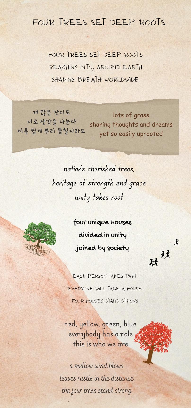 We presented the idea that students could contribute to the poem to faculty and students of all levels, and the student contributions started to come in from grades 6 through 12. Korean teacher Alison Cha had her students write in Korean contributions to which she then provided translations. Steven ordered all the student writing into a reasonably coherent overall poem. While a few edits were made for clarity, each verse is presented very close to, if not entirely as, it was originally submitted. A substantial part of the community-building experience of creating a poem like this one is that everyone’s lines become integrated into whole poem without writing credit for each individual contribution.