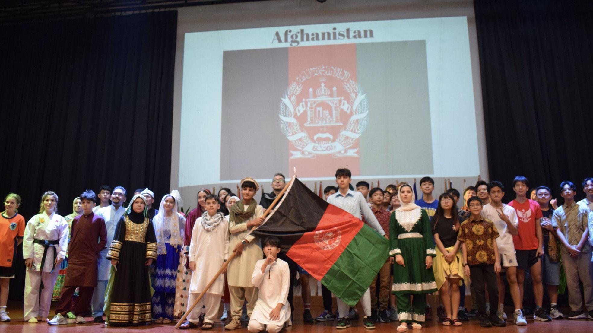 RLN students and the students from the RLN club pose together with the Afghan flag at Unity in Diversity Day.