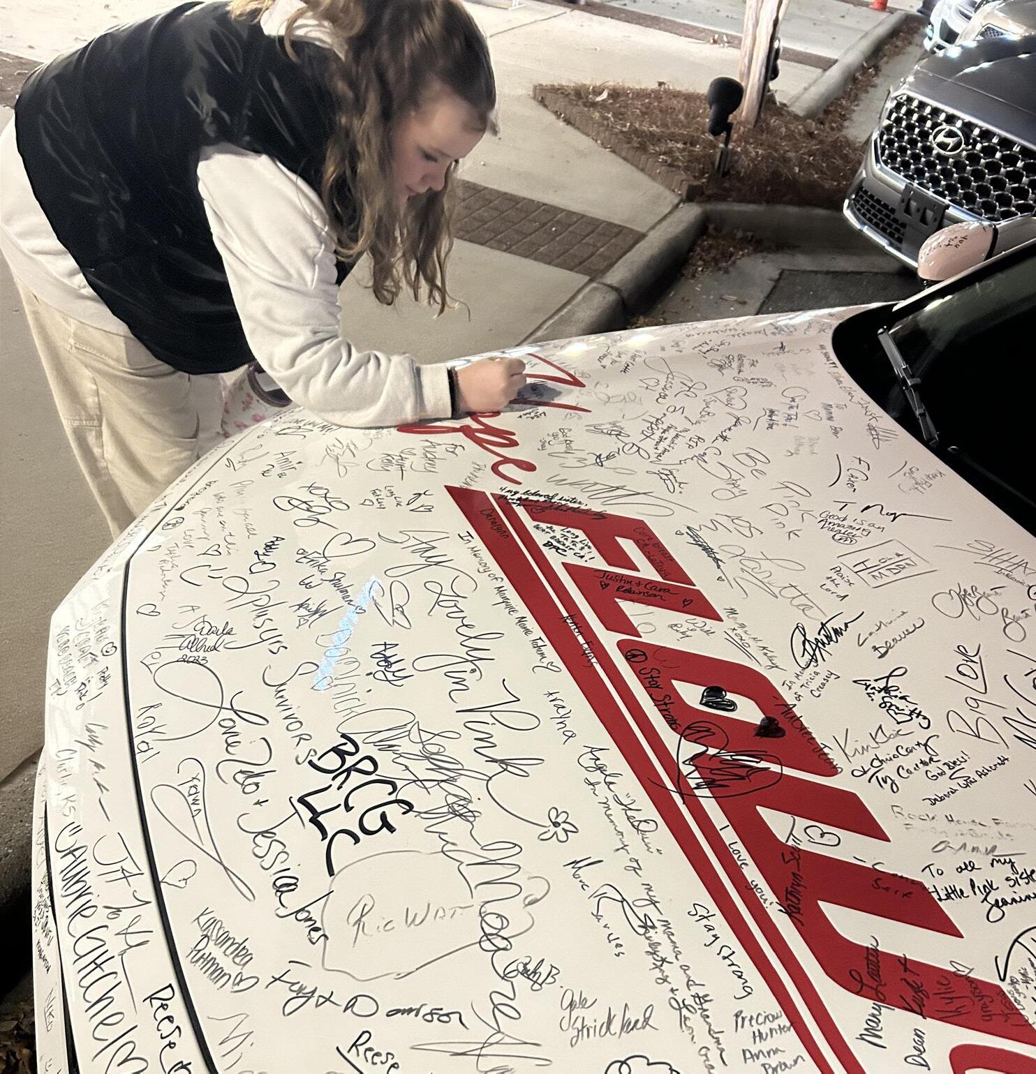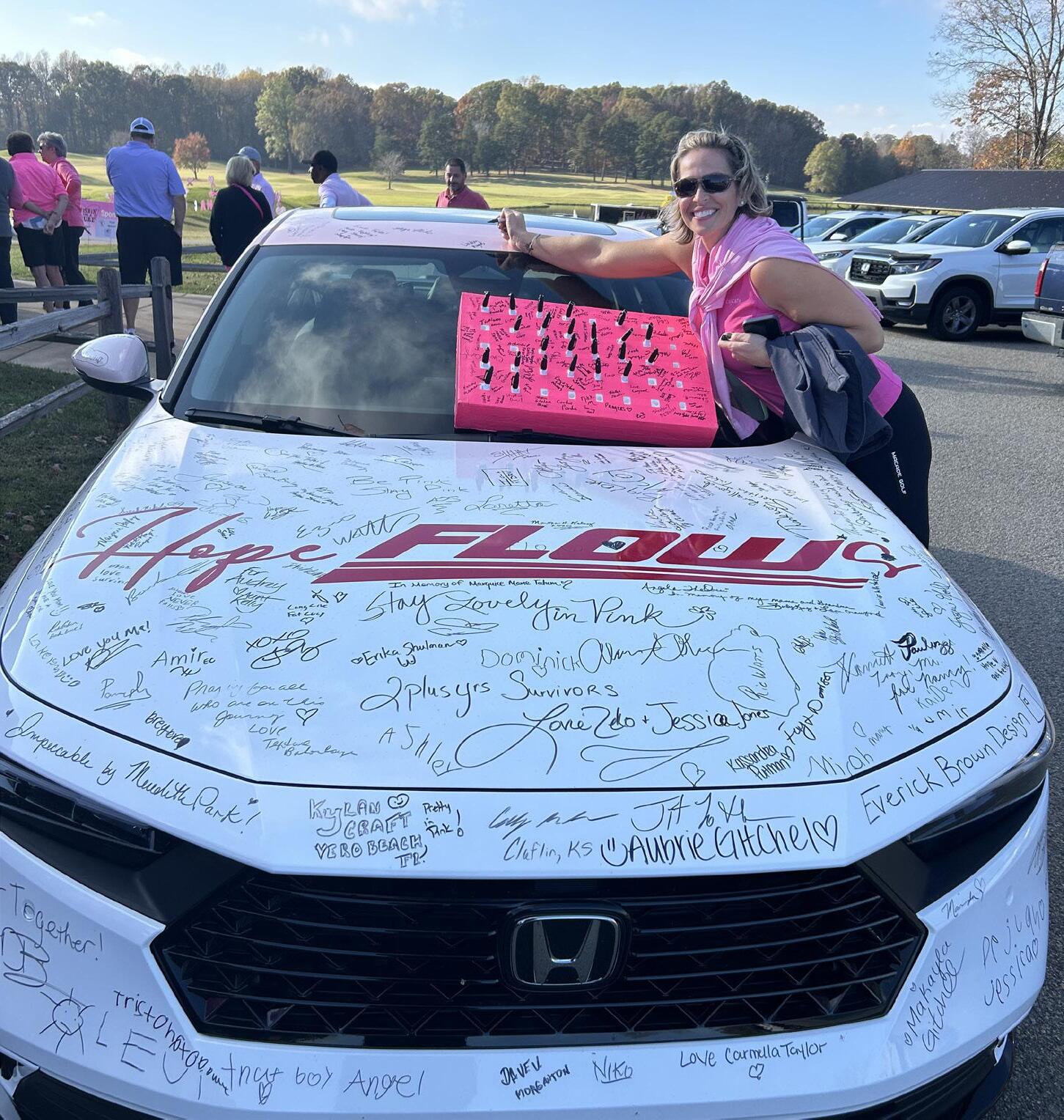 We are thrilled to announce our exciting new partnership with Flow Honda Winston Salem. With just a $1 donation, individuals have the opportunity to sign HOPE FLOWs (every dollar counts in funding critical breast cancer research). You can find HOPE FLOWs at our events, where you can add your signature and become part of this inspiring movement. Additionally, keep an eye out around the Triad, as you never know when Angela might appear with our fabulous pink Honda Accord, courtesy of: