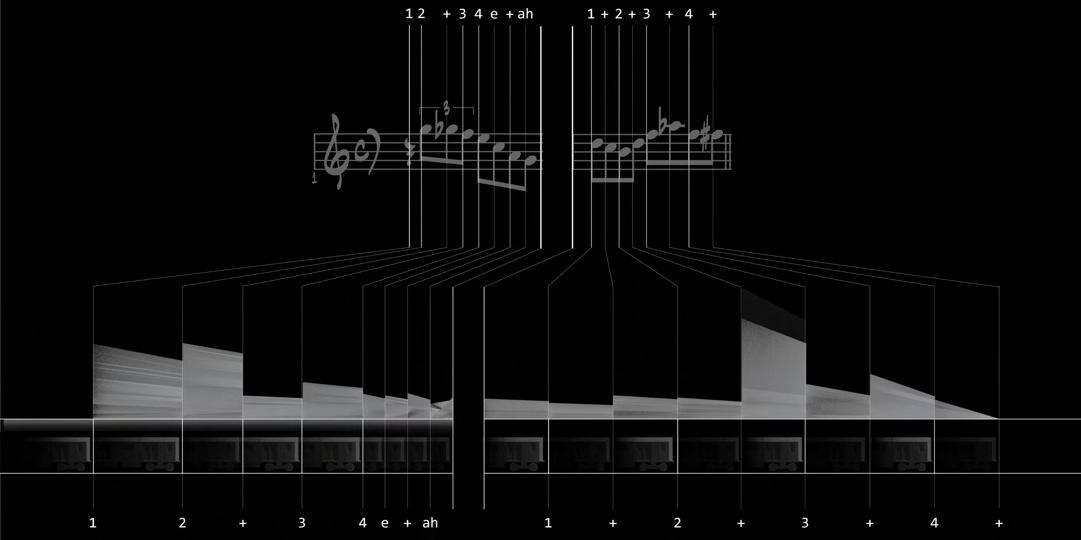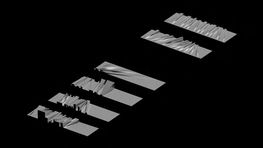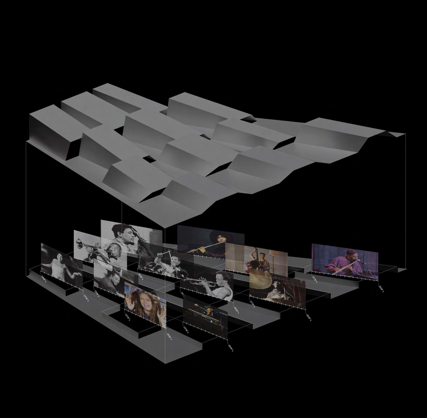 THIS PROJECT IS ABOUT AN ARCHIVE OF NEW YORK JAZZ. UTILIZING THE SPATIAL MECHANICS OF THE VIDEOGAME PORTAL, THE ARCHIVE BECOMES A SPATIAL TRANSFORMATION OF THE FABRIC OF THE JAZZ SWING STREETS, MANIFESTED AS A SERIES OF COMPRESSED AND DEFORMED BARS THAT COMPOSE THE MASSING OF THE ARCHIVE. THE PROJECT WAS TAUGHT BY DIANA AGREST.