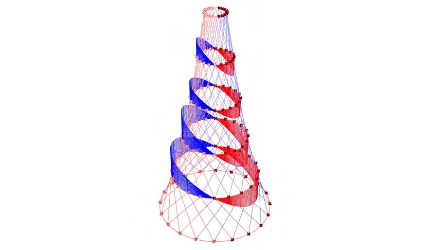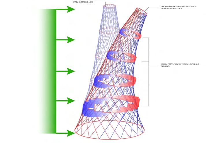 From the initial script, without diving into windloads, I focused on the degrees by which loads transfer between each hyperbolic structural module. With the rings primarily in tension and the vertical memebers in compression.