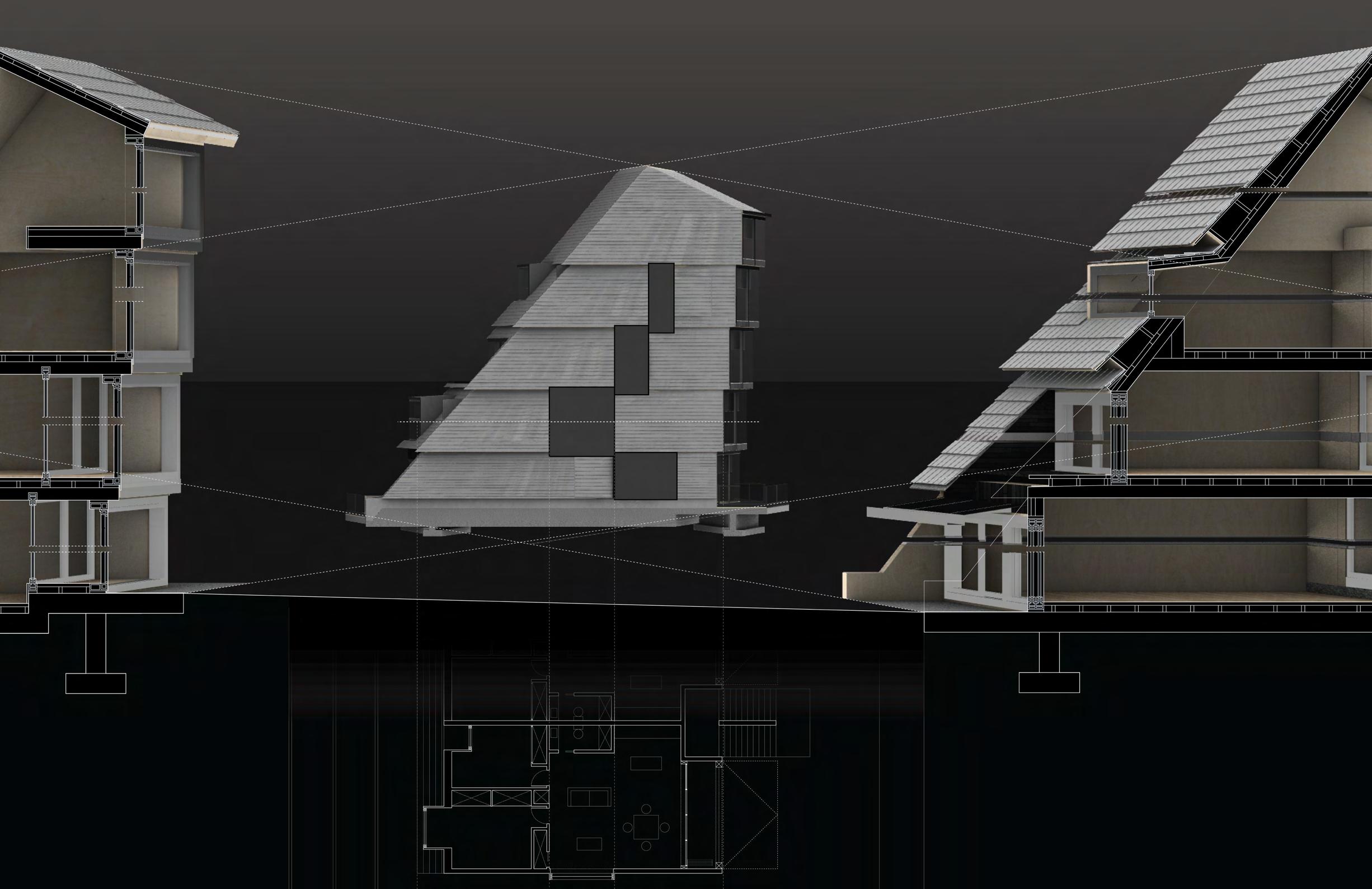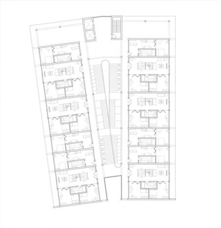 Fig. 4a Section of buffer building. Fig. 4b Plans.Given the constraints of row housing, this project became an investigation of how to create more flexibilty and diversity on the front and the back.