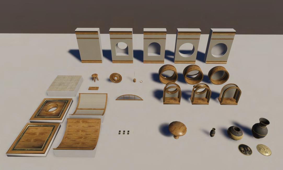 I used Trim Sheets to texture the majority of the architectural props, to reduce the amount of time to texture each. To create them I would create a model of the sheet in Blender and bake and texture it onto a flat plane for texture maps in Substance Painter.