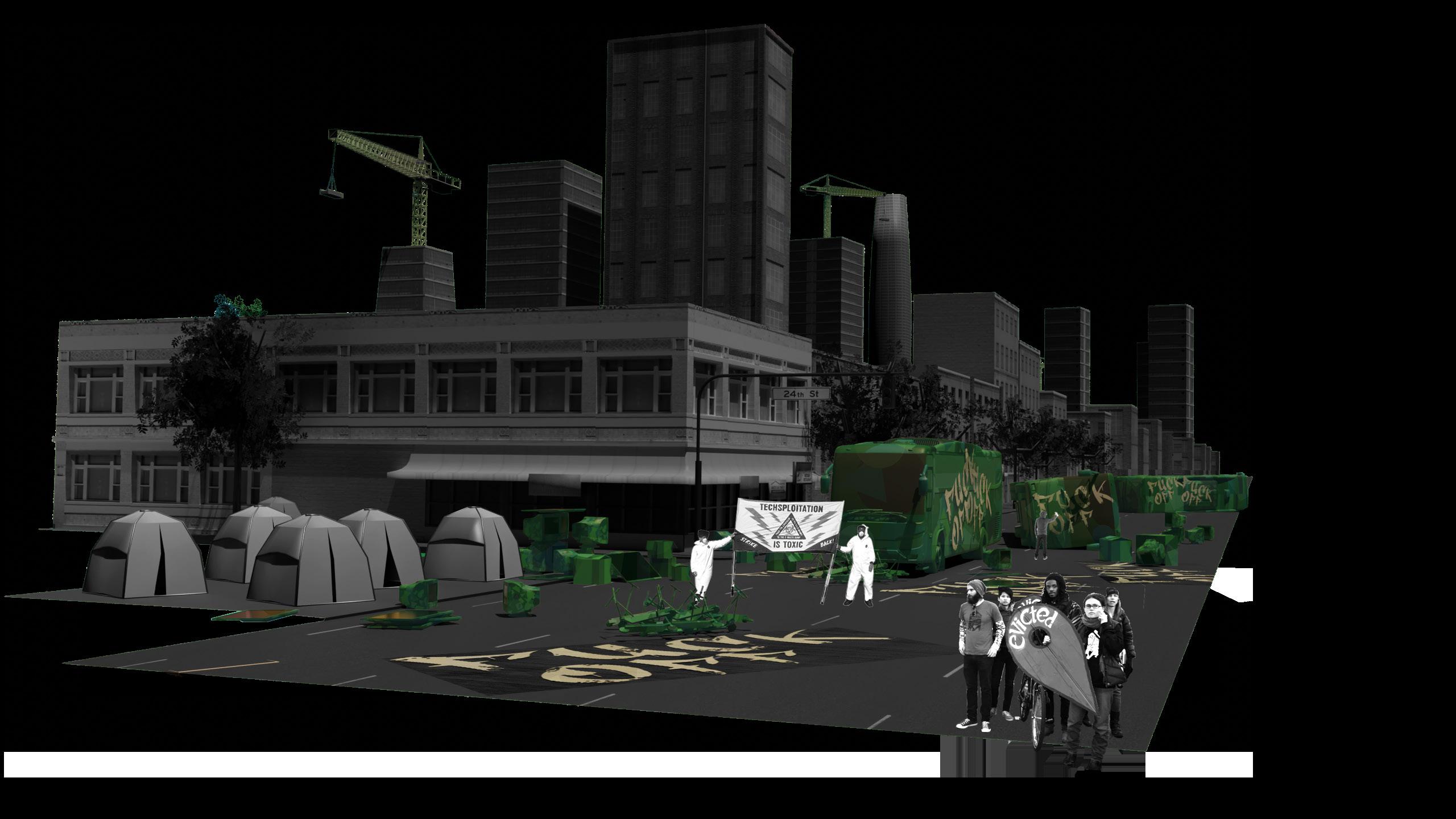THIS IS MY THESIS PROJECT ABOUT CONSTRUCTING A RESPONSE TO THE ACCUMULATING RESIDUE OF THE BAY AREA TECH INDUSTRY. PRIMARILY TAKING PLACE IN THE HEART OF SAN FRANCISCO, THE PROJECT CONSISTS OF A SERIES OF VIGNETTES THAT EXPLORE A WORLD WHERE THE WASTE GENERATED BY BIG TECH BECOMES THE CATALYST FOR COMMUNITY ENGAGEMENT. THE PROJECT IS ADVISED BY BRAD SAMUELS.