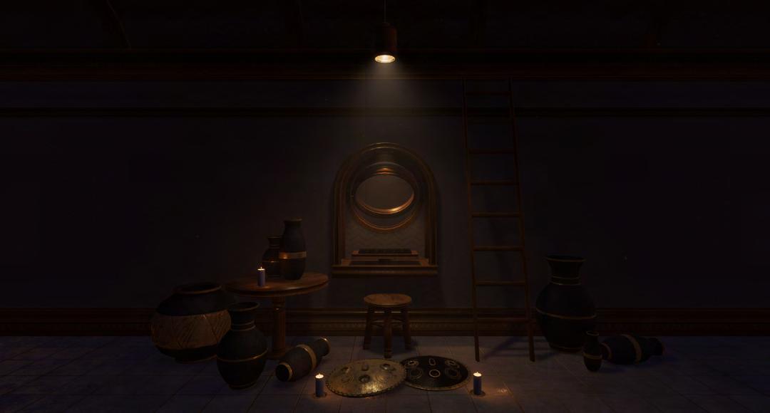 The main menu screen when you open up the game. The backdrop of the menu is rendered in real time, with a subtle dust particle animation.