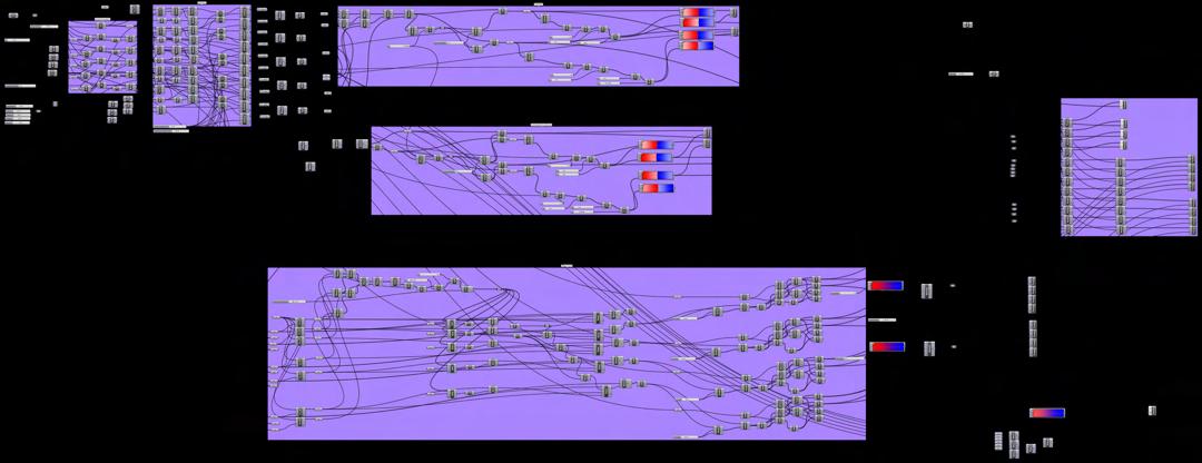 After getting a solid foundation of the load transfering between each of the modules, the new problem became understanding the way windloads impact the structure and making that work in grasshopper. Here the script outputs the loads on the ring with colored surfaces, and the vertical members with colors.