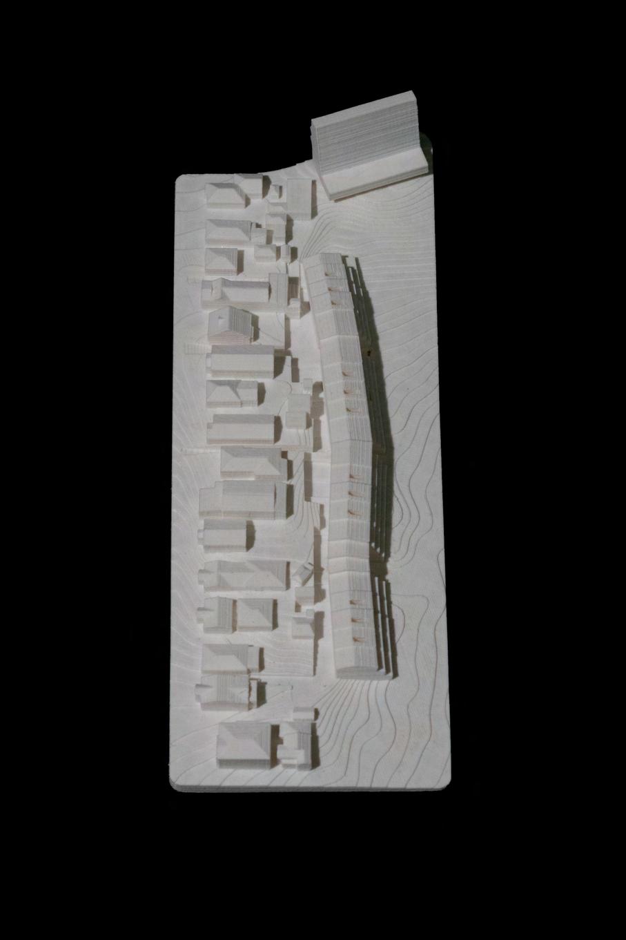 This is a massing model of the project as it sits on the site. The project consists of a series of row apartments that are organized in a long row, enclosed by a highway buffer building on the north edge, with a public park on the east. Made by Sam Dobens.