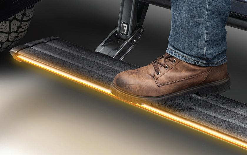 • Full-length LED Glow Light seamlessly integrated into the contours of the AMP Vision powered step for an upgraded illumination experience.