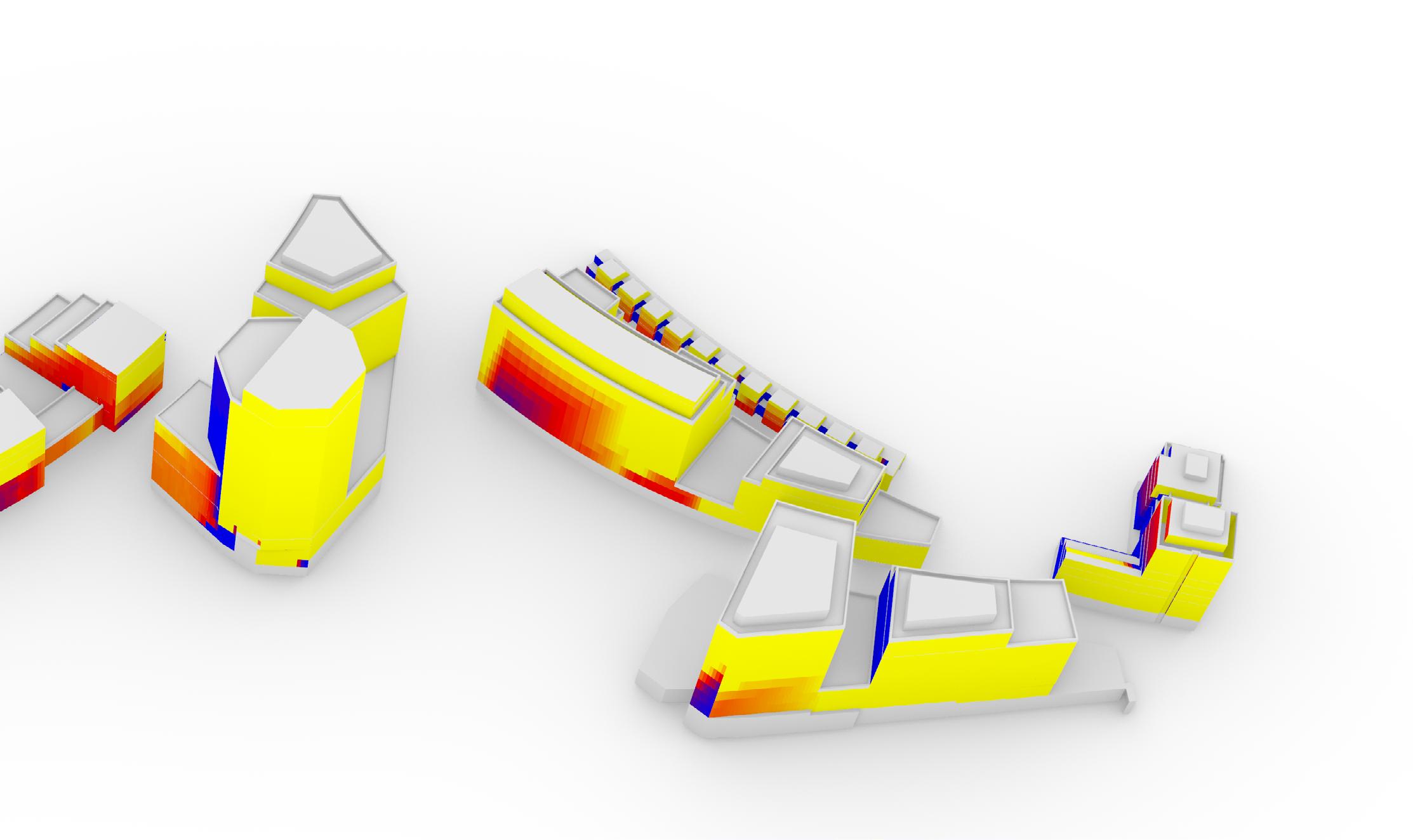 Overall, 51% of the tested facade panels are oriented within 90 degrees of due south. Of these, 52% would achieve at least 1.5 hours of sunlight at the equinox, an additional 11% would receive at least 1 hour of direct sunlight. 14% would receive between 30