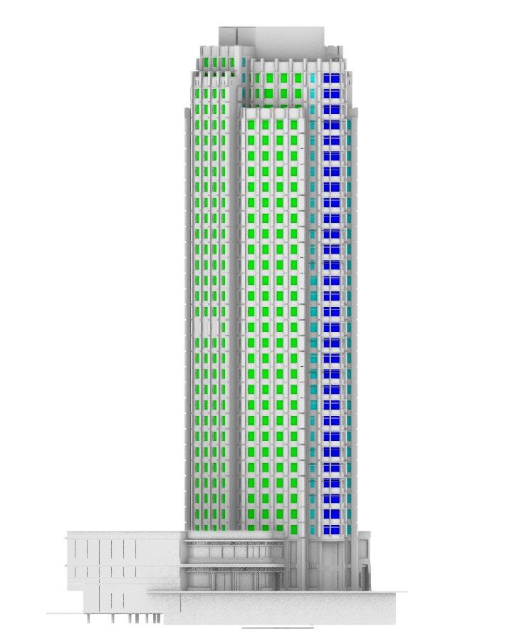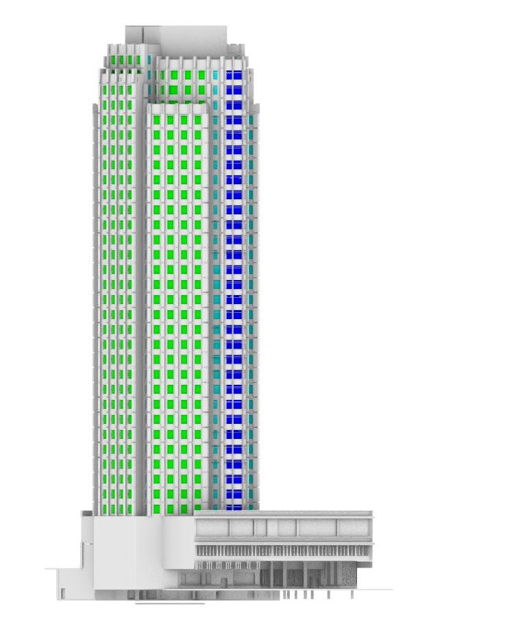 Sunlight access is also good, with 74% (344 out of 462) of the residential units seeing the recommended solar exposure. within the student accommodation, a combination of studios and cluster units with shared facilities is provided. 26 out of 54 well exceed the minimum solar exposure within the shared kitchen/ dining space. A further 20 fall short only marginally, seeing up to 15 minutes less than recommended. Therefore, occupants of these units will have access to good levels of sunlight. Additionally, all students have access to good levels of sunlight within the shared amenity provided on L31, as well as on the open rooftop terraces.