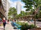 Open space features including water features in the Cascades, and seating for groups have been incorporated into the landscape design.