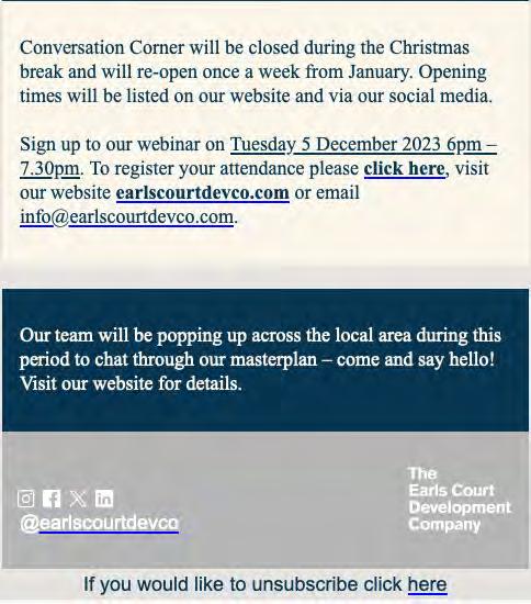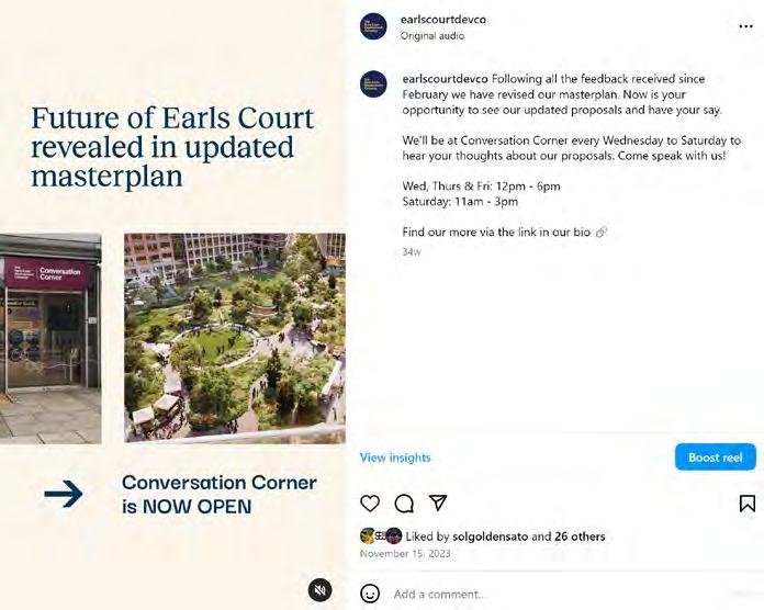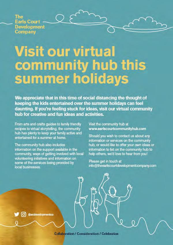 The process has involved a variety of initiatives including establishing a Community Hub hosting a range of events, services and activities; the Earls Court Community Fund which has provided 60 cash grants to 32 organisations since 2021; and an extensive programme of work with schools, youth groups and young people. More information on these activities and initiatives can be found in the supporting Social Value and Economic Impact Report (Appendix 9). The ECDC team has also regularly volunteered in the local community, building strong personal relationships and engaging with charities and community groups to ensure their voices have been heard.