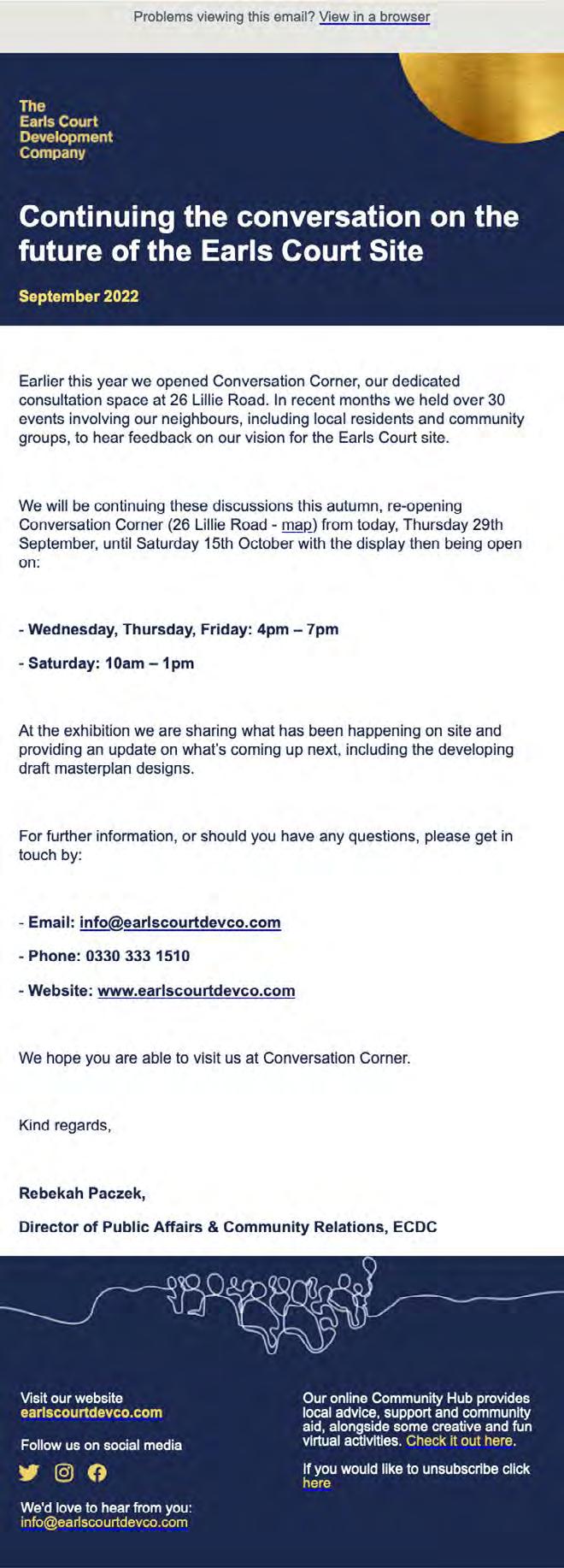 Sent regular email updates to over 2,500 community and political stakeholders, including members of the public who have engaged with the consultation and requested regular updates
