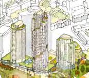 Exhibition and workshop conversations about height and massing of tall buildings at centre/north of and tapering down to edges.