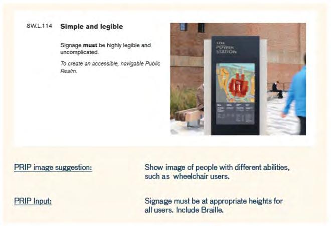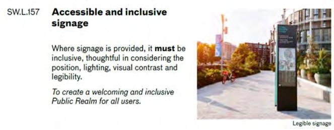 Incorporation of specific design codes relating to inclusive signage and seating.
