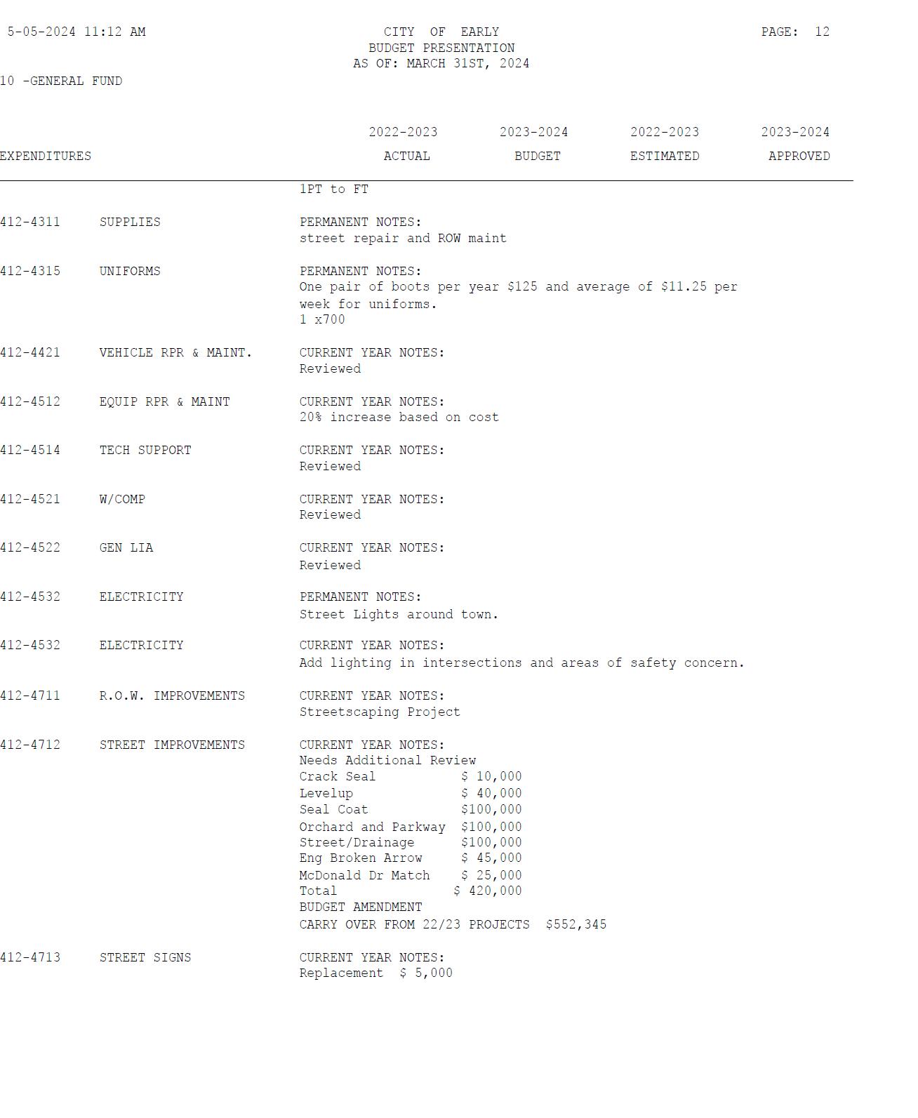 2023-2024 ADOPTED BUDGET City of Early, TX | FY2023-2024 Adopted Budget 63 Streets Blue Bonnet Drive from Grandview to Longhorn Capital Improvement General Funds Engineering $0.00 Parks Pave McDonald Park Parking Lot Capital Improvement General Funds $30k $30K Parks Pave Ballpark Parking Lot Capital Improvement General Funds $20K $0 Six Year Total $16,475,237