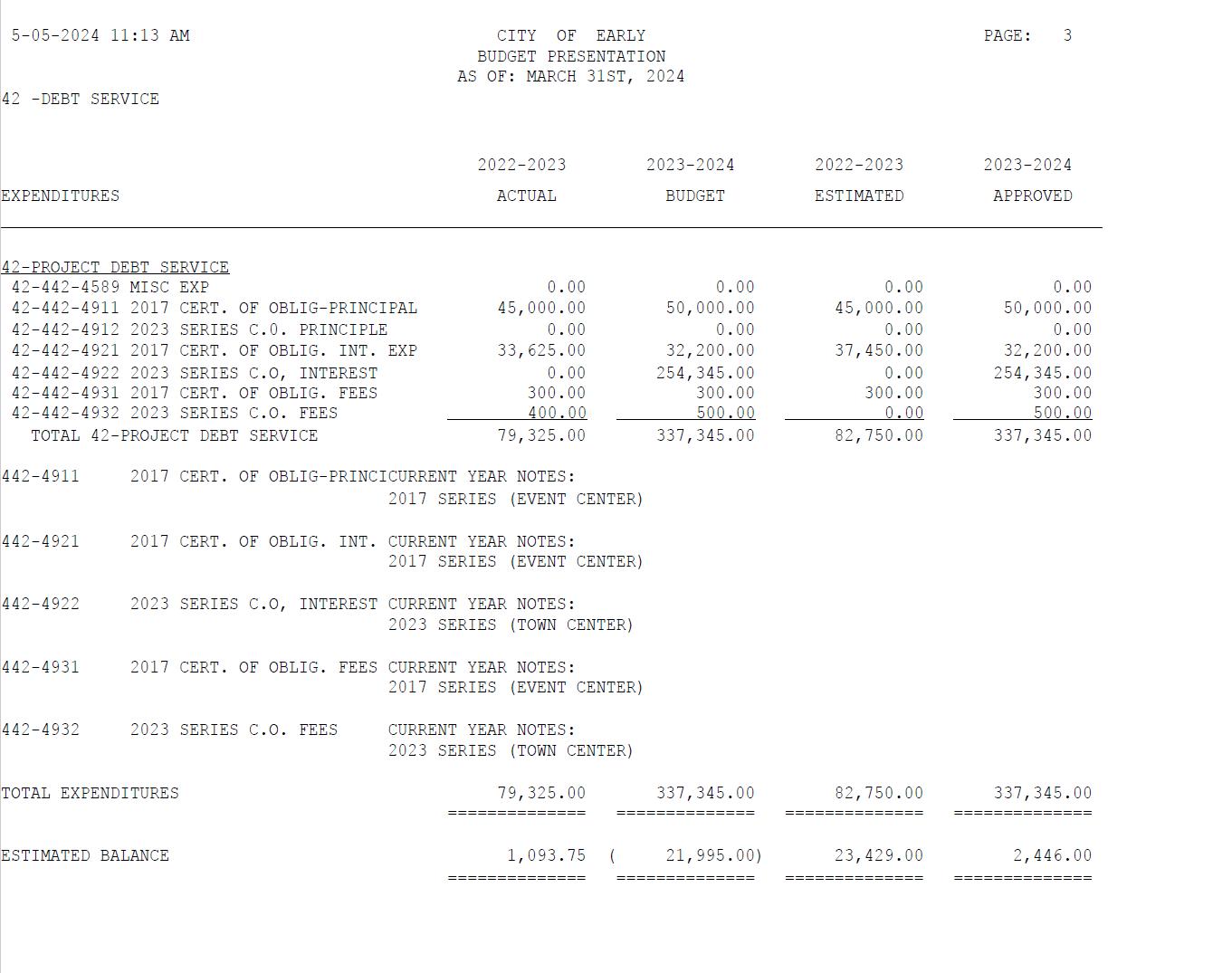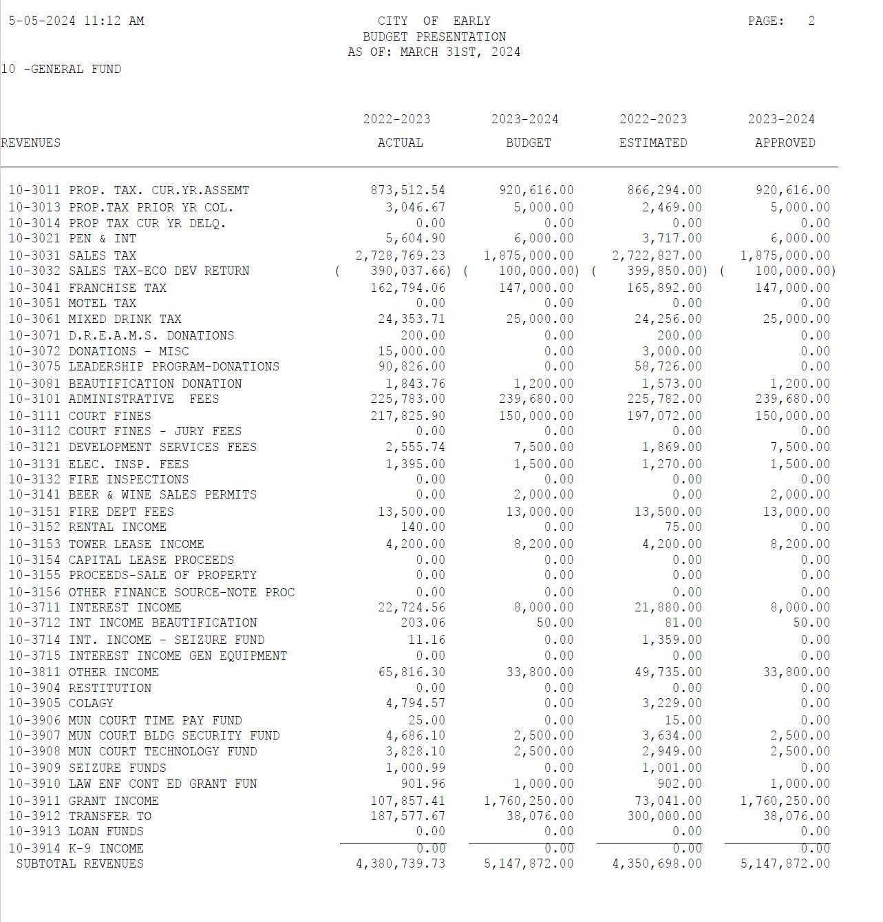 2023-2024 ADOPTED BUDGET City of Early, TX | FY2023-2024 Adopted Budget 65 ESTIMATED REVENUE SANITATIONCAPITAL DEBT PROPERTY TOTAL FUNDPROJECTS SERVICE MGMT Beginning Balance 109, 4433,880,00043,52513,6516,886,603 Construction Funds Balance 12,007 Property Taxes 482,748 1,414,364 Sales Tax 2,280,000 Franchise Tax 147,000 Motel Tax 216,000 Alcoholic Beverage Tax 25,000 Event Income 0 Leadership Program 0 Beautification 1,200 Court Fines 155,000 Permits & Inspections 14,000 Fire Department Fees 13,000 Rental / Lease Income 33,000130,700 Sale of Property 0 Grant Income 1,161,250 Loan Funds 0 Other Income 250 100105,750 Use/Admin Fees 546,000 2,875,680 Agriculture Income 78,000 Contract Services 73,000 73,000 Taps 3,500 Transfer To 1,213,250200,000 1,413,250 TOTAL REVENUES 728,6935,093,250726,27346,75116,993,297 TOTAL CONSTRUCTION FUNDS 12,007 ESTIMATED EXPENDITURES SANITATION DEBT PROPERTY TOTAL FUND SERVICE MGMT Personnel 242,900 3,457,250 Operations, Supplies, Etc. 335,280 2,821,914 Capital Outlay 48,8005,050,000 8,470,150 Events 0 Transfer From 0 Debt Service 76,500 670,04533,0001,934,955 TOTAL EXPENSE 703,4805,050,000670,04533,00016,684,269 ENDING FUND BALANCE 25,21343,25056,22813,751309,028